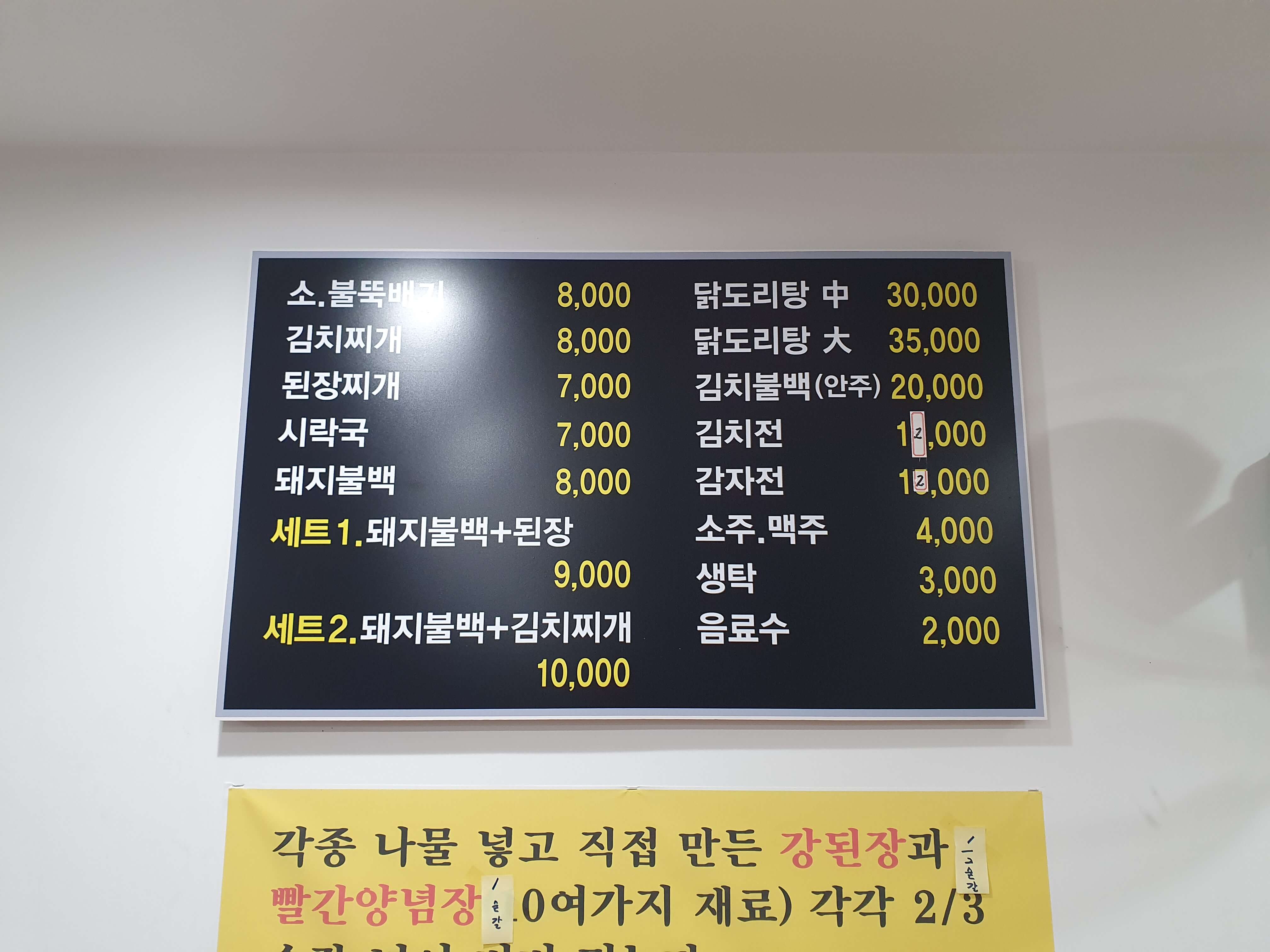 - 주메뉴 : 소불뚝배기, 김치찌개, 된장찌개, 시락국, 돼지불백, 닭도리탕 등