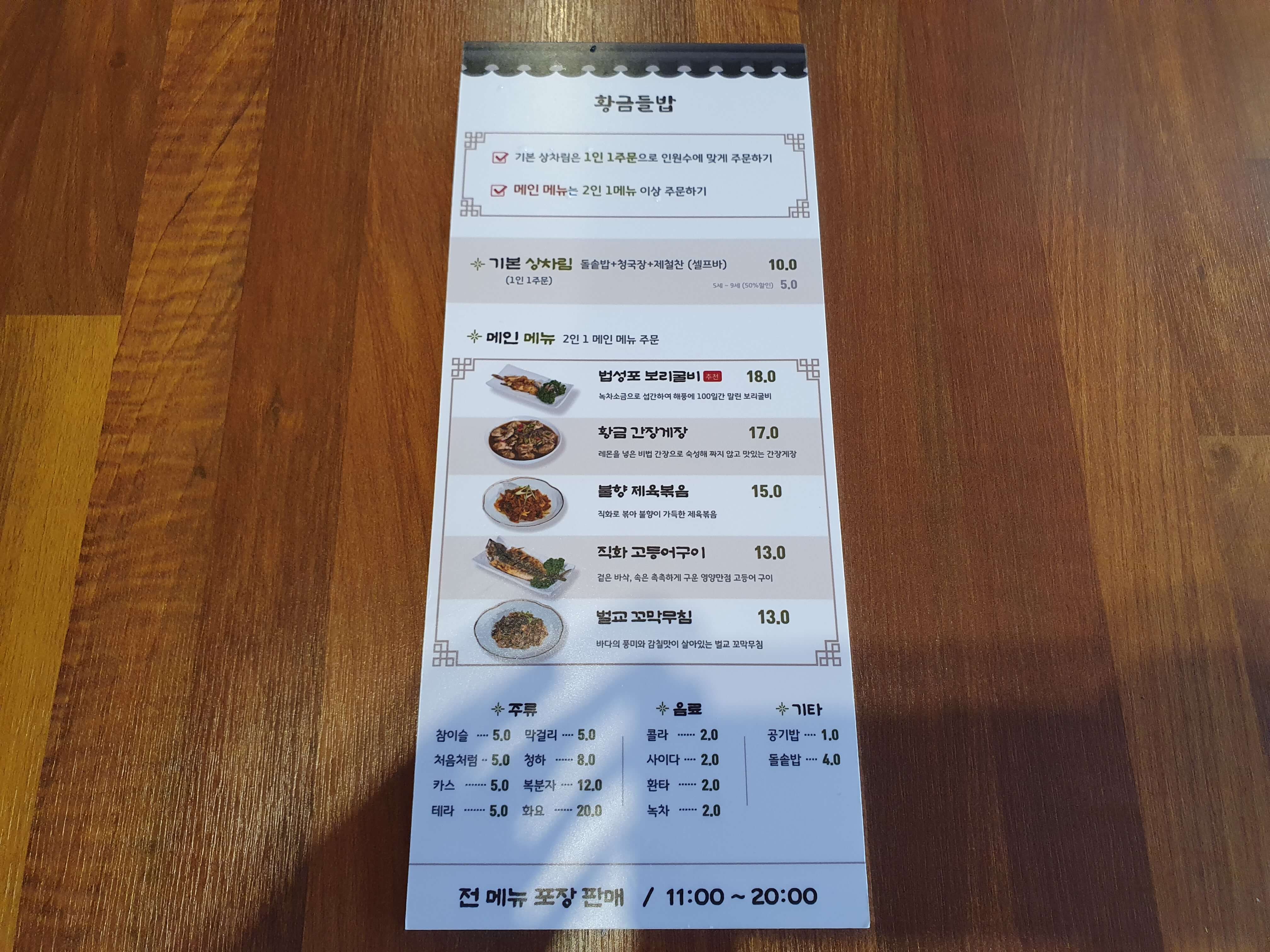 - 기본 상차림(1인 1주문) 돌솥밥+청국장+제철찬(셀프바) 가격 10,000원 / 5세~9세(50% 할인) 가격 5,000원