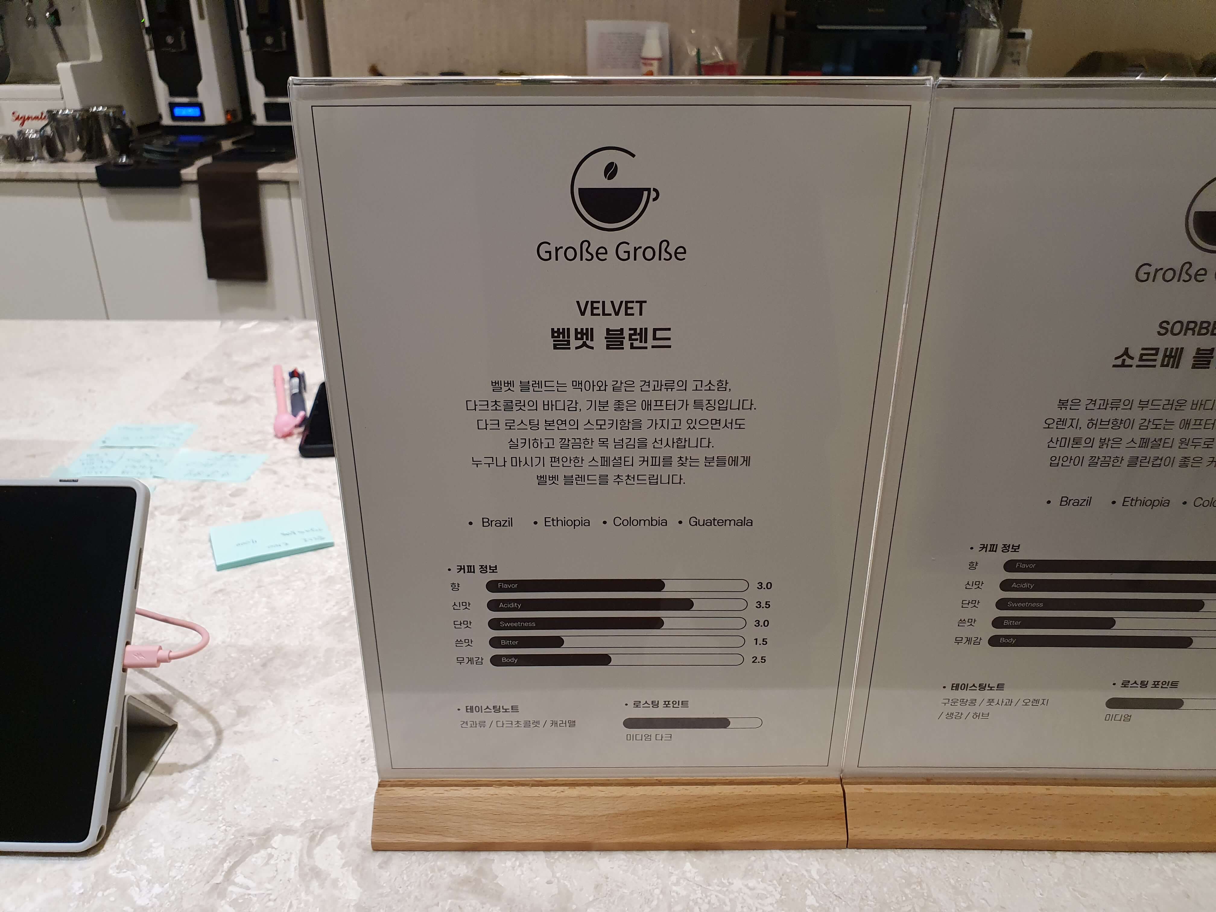 - 벨벳 블렌드는 맥아와 같은 견과류의 고소함, 다크초콜릿의 바디감, 기분 좋은 애프터가 특징입니다.