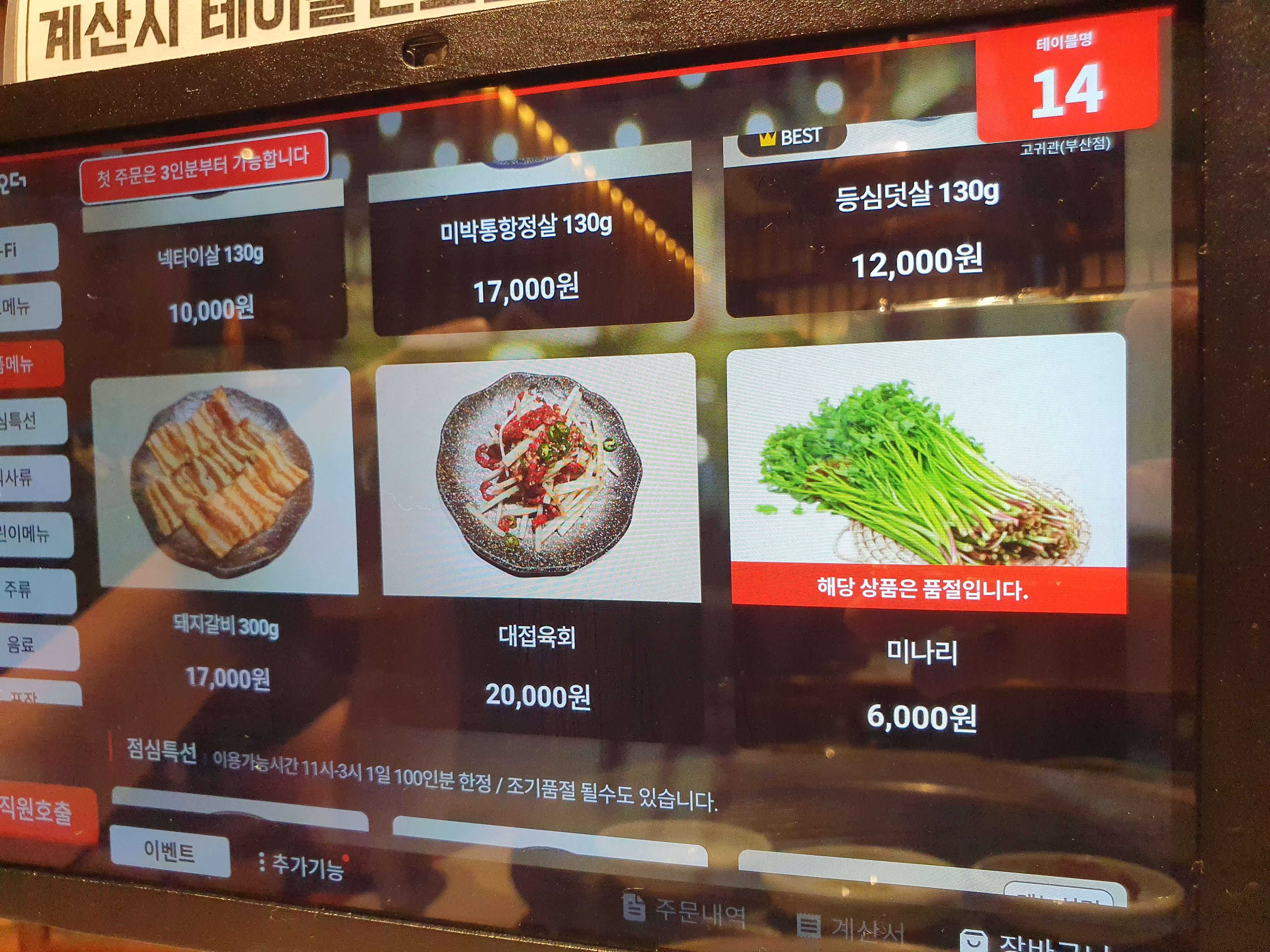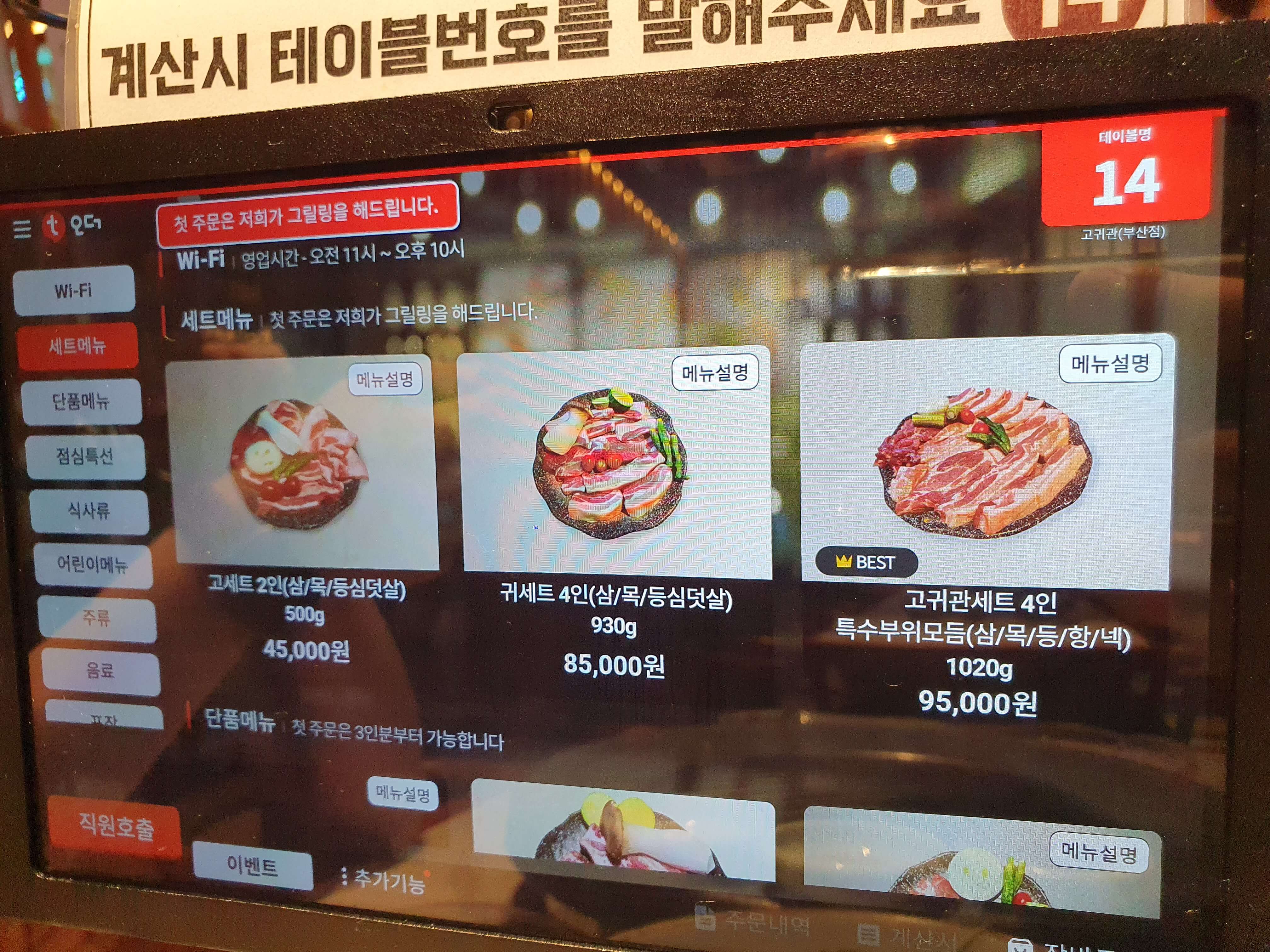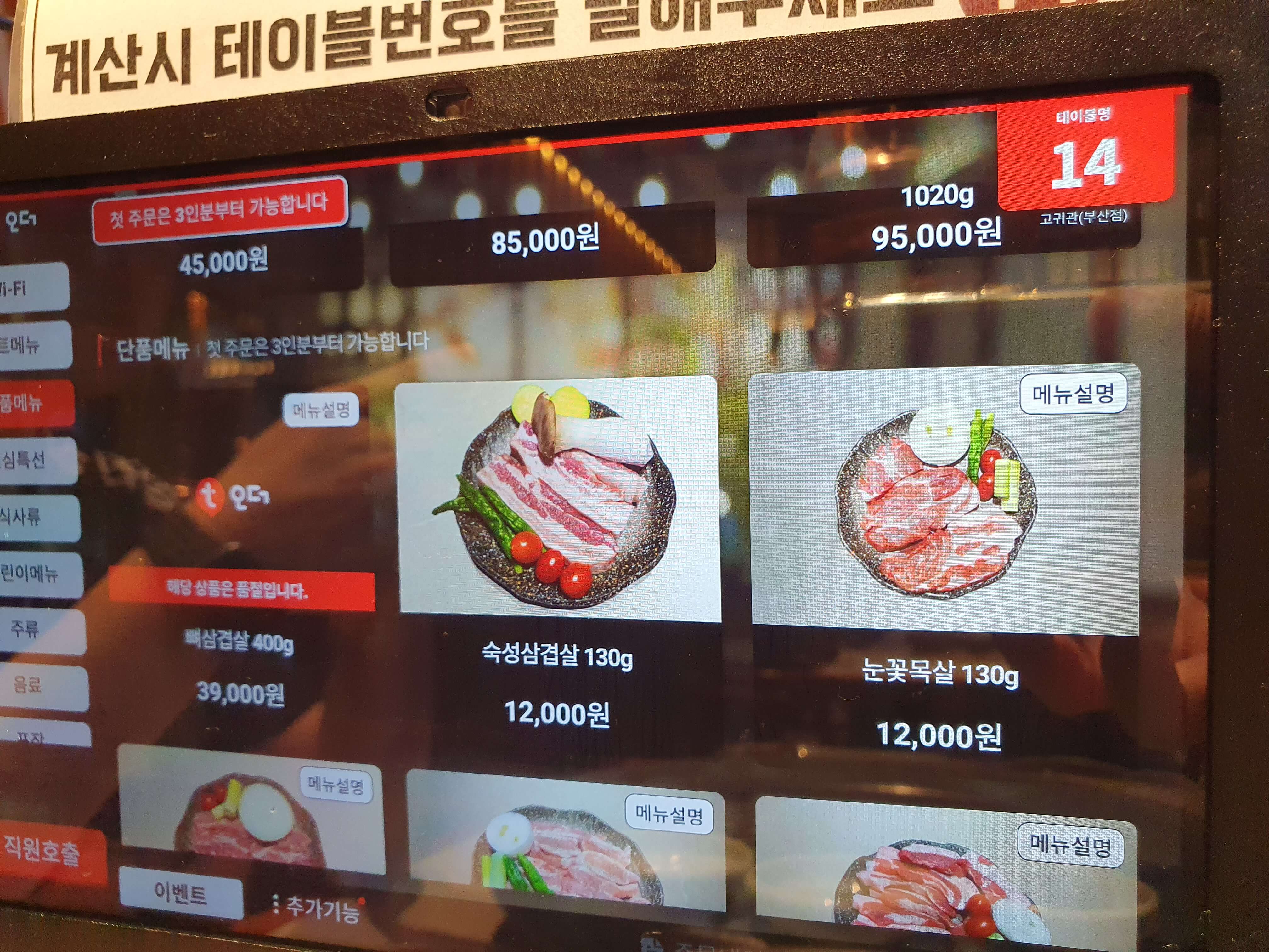 원래는 직원이 고기를 구워주는 식당인데 직원이 부족한 탓인지 직접 구워먹게 되었습니다.