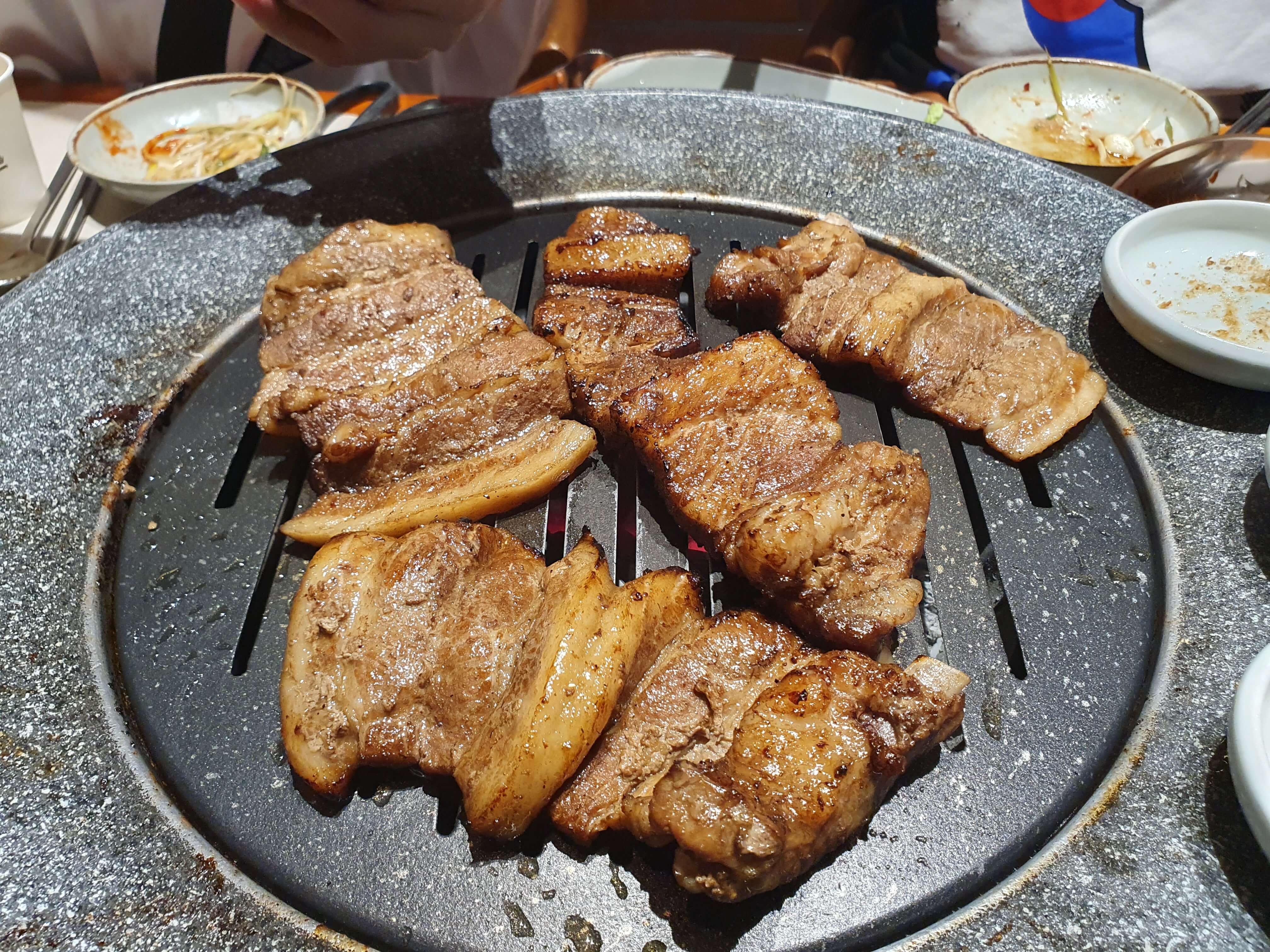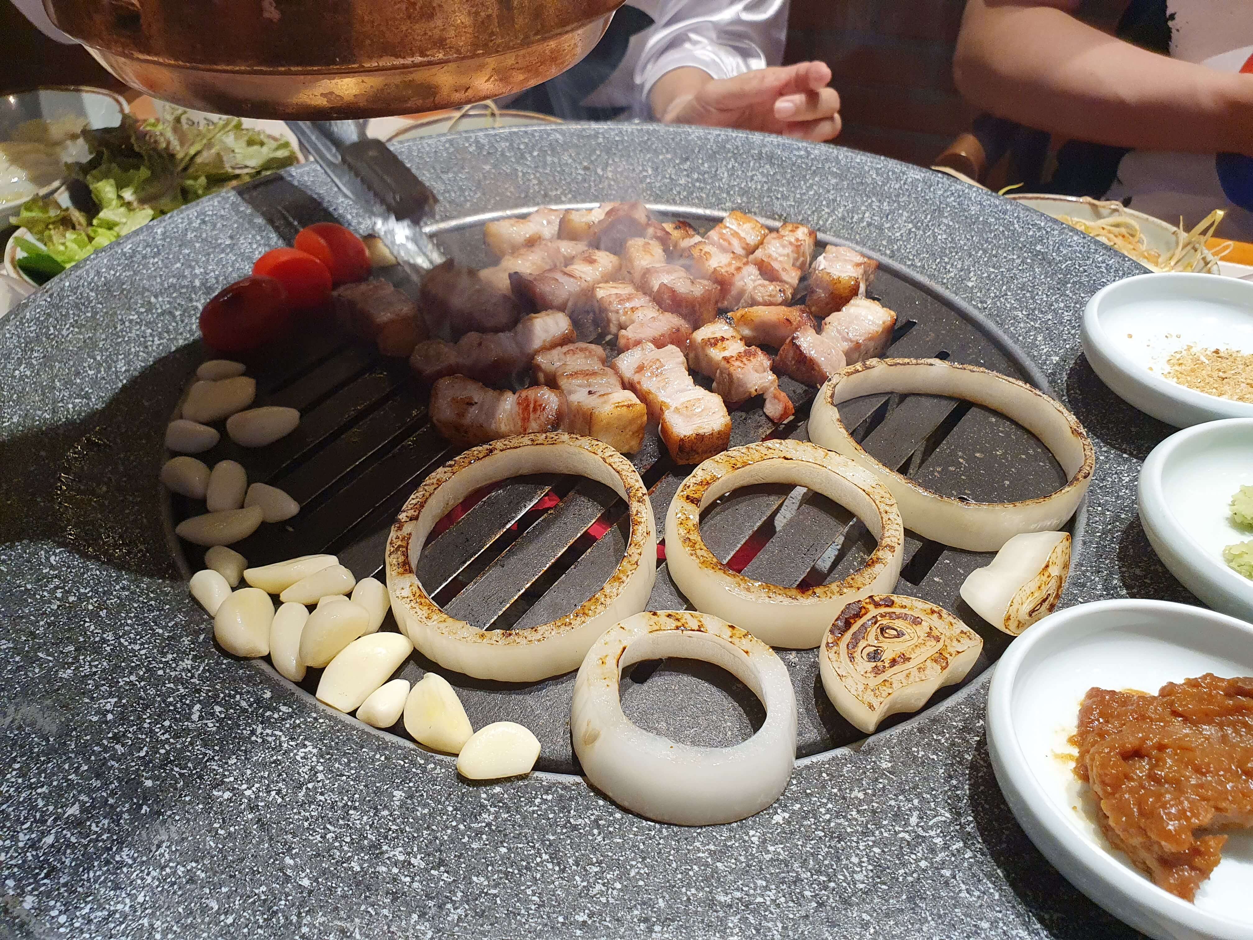 불판 위에 올려진 풍성한 마늘과 고기들을 보니 괜히 행복합니다.