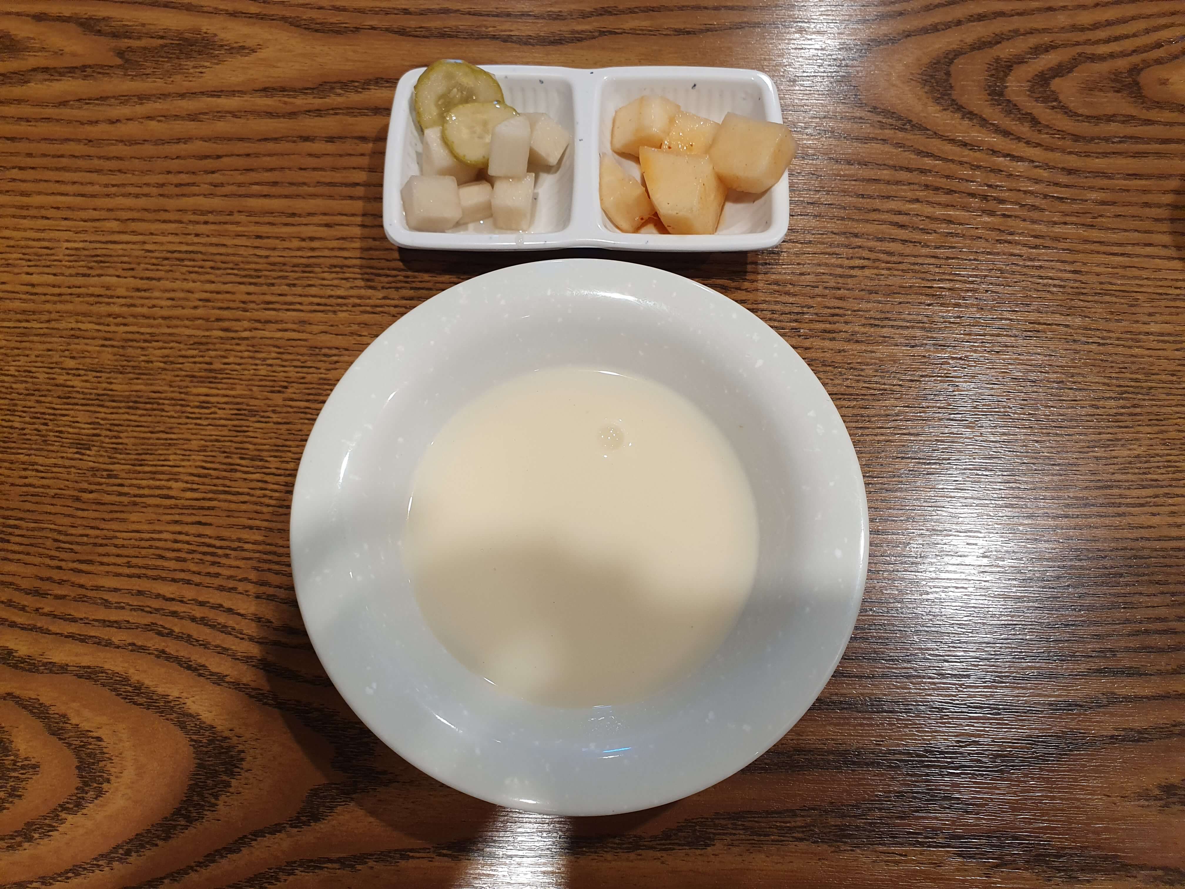 메인 메뉴가 나오기 전 식전 스프와 피클, 깍두기가 나옵니다.