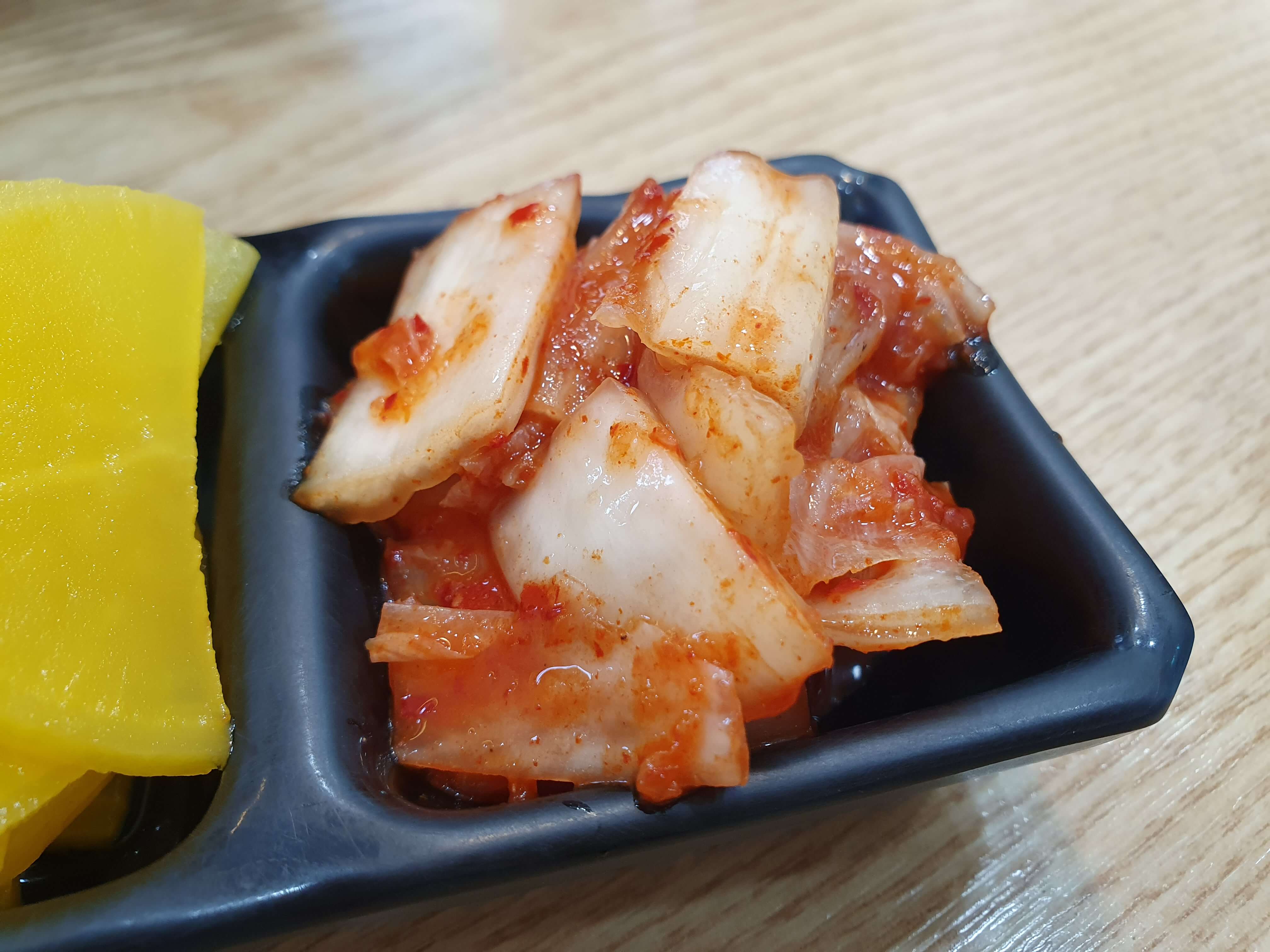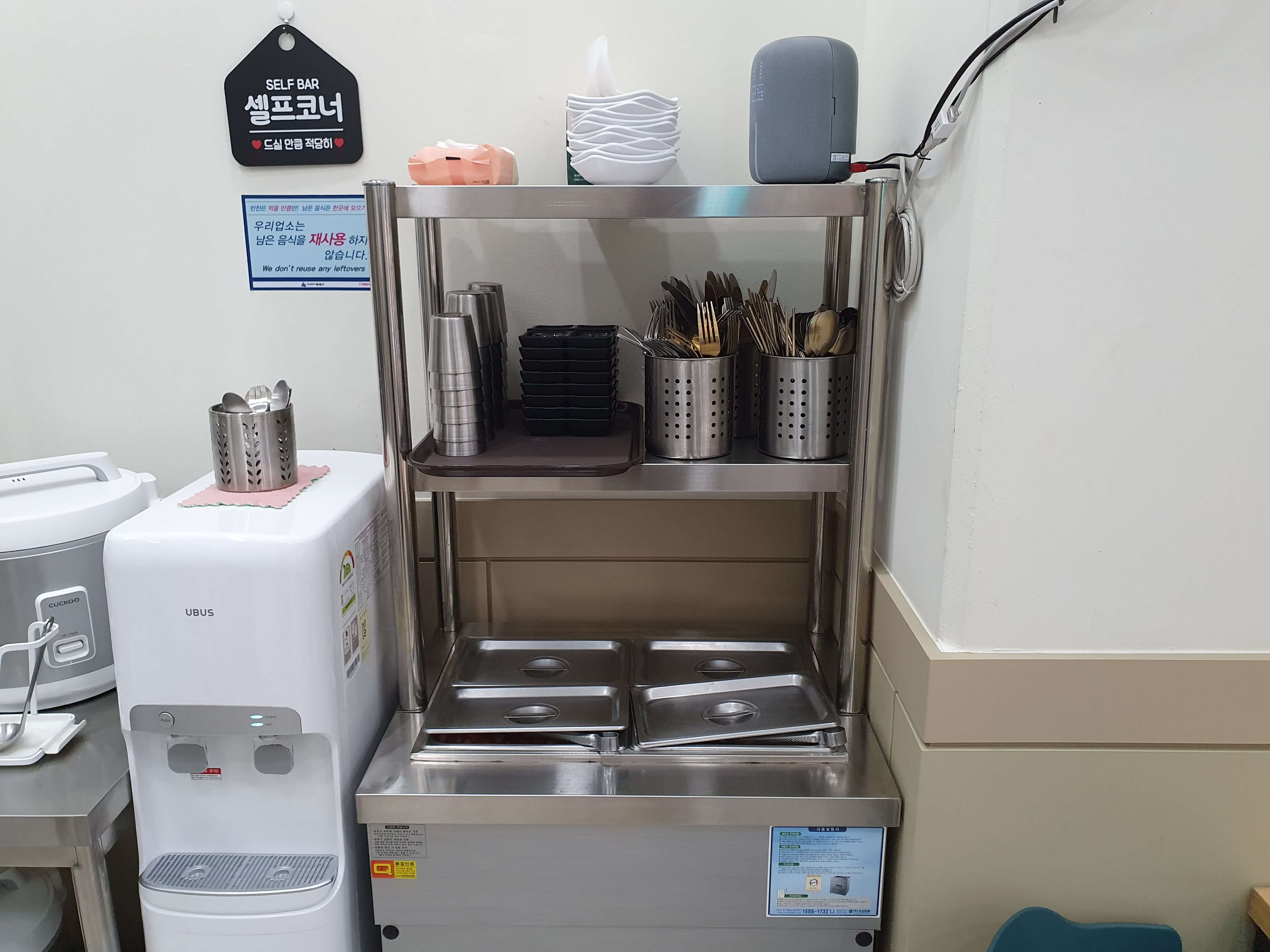단무지와 김치는 시제품 맛이 나며, 추가 반찬, 앞접시, 물, 숟가락, 젓가락은 셀프입니다.