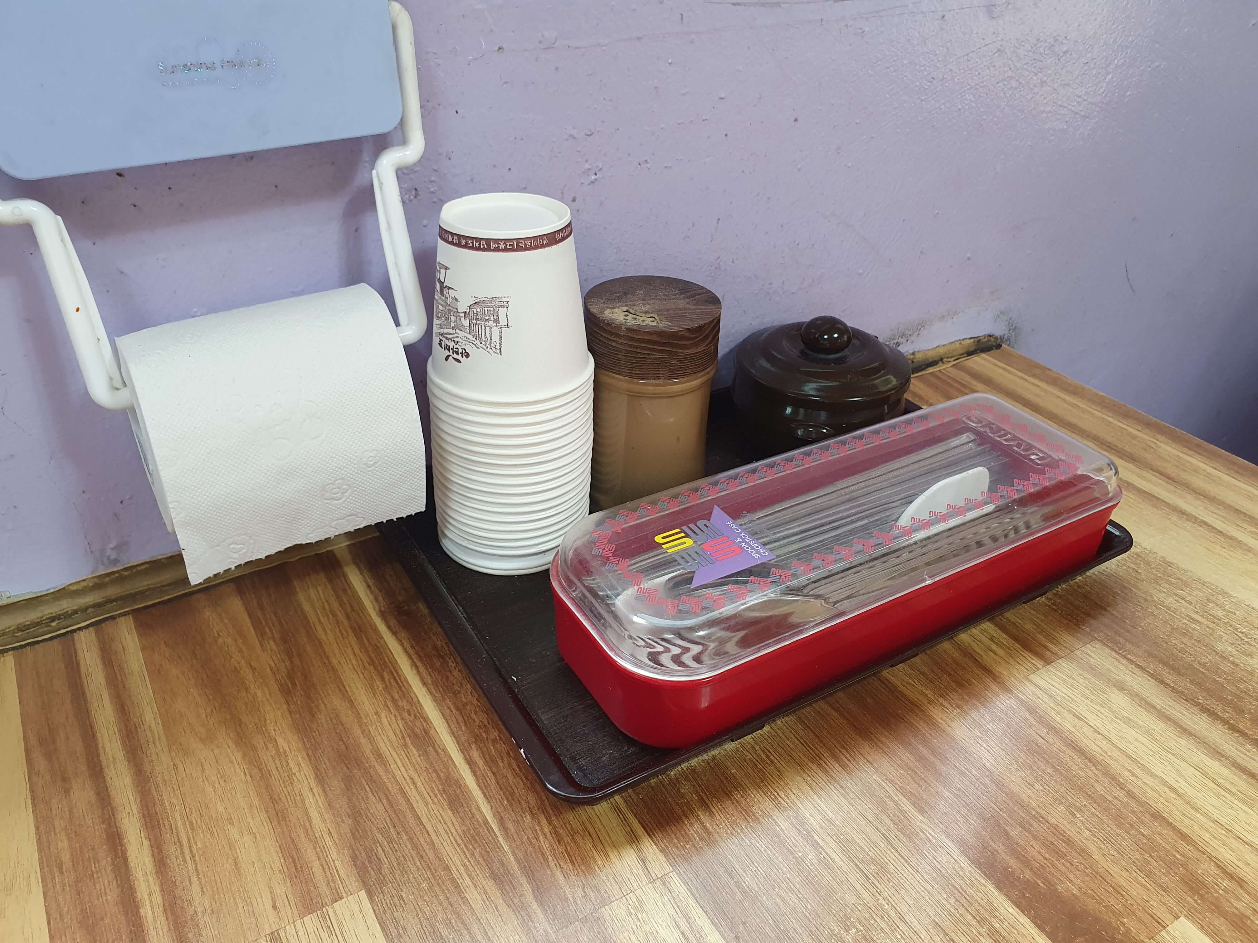 테이블에는 휴지, 종이컵, 후추, 소금, 수저통이 준비되어 있습니다.