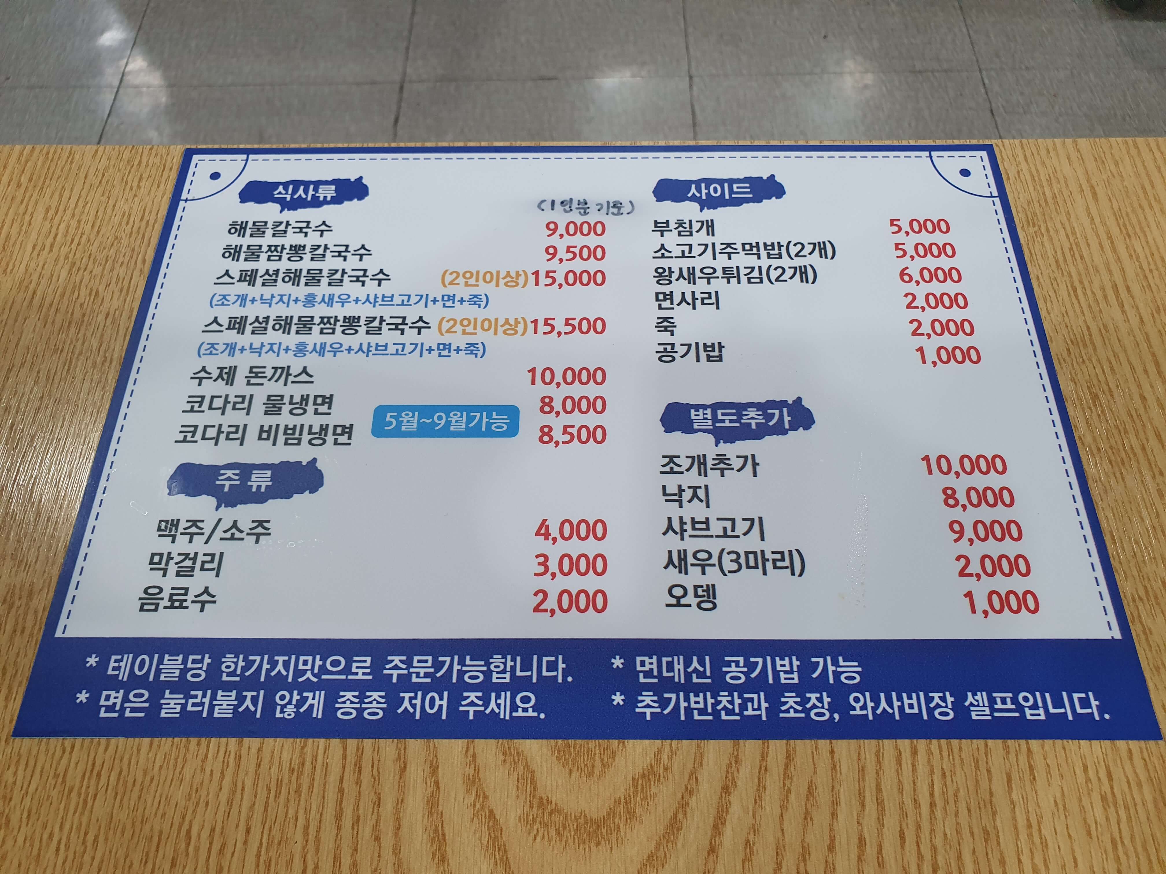 - 주메뉴 : 해물칼국수, 해물짬뽕칼국수, 스페셜해물칼국수, 스페셜해물짬뽕칼국수, 수제돈까스 등