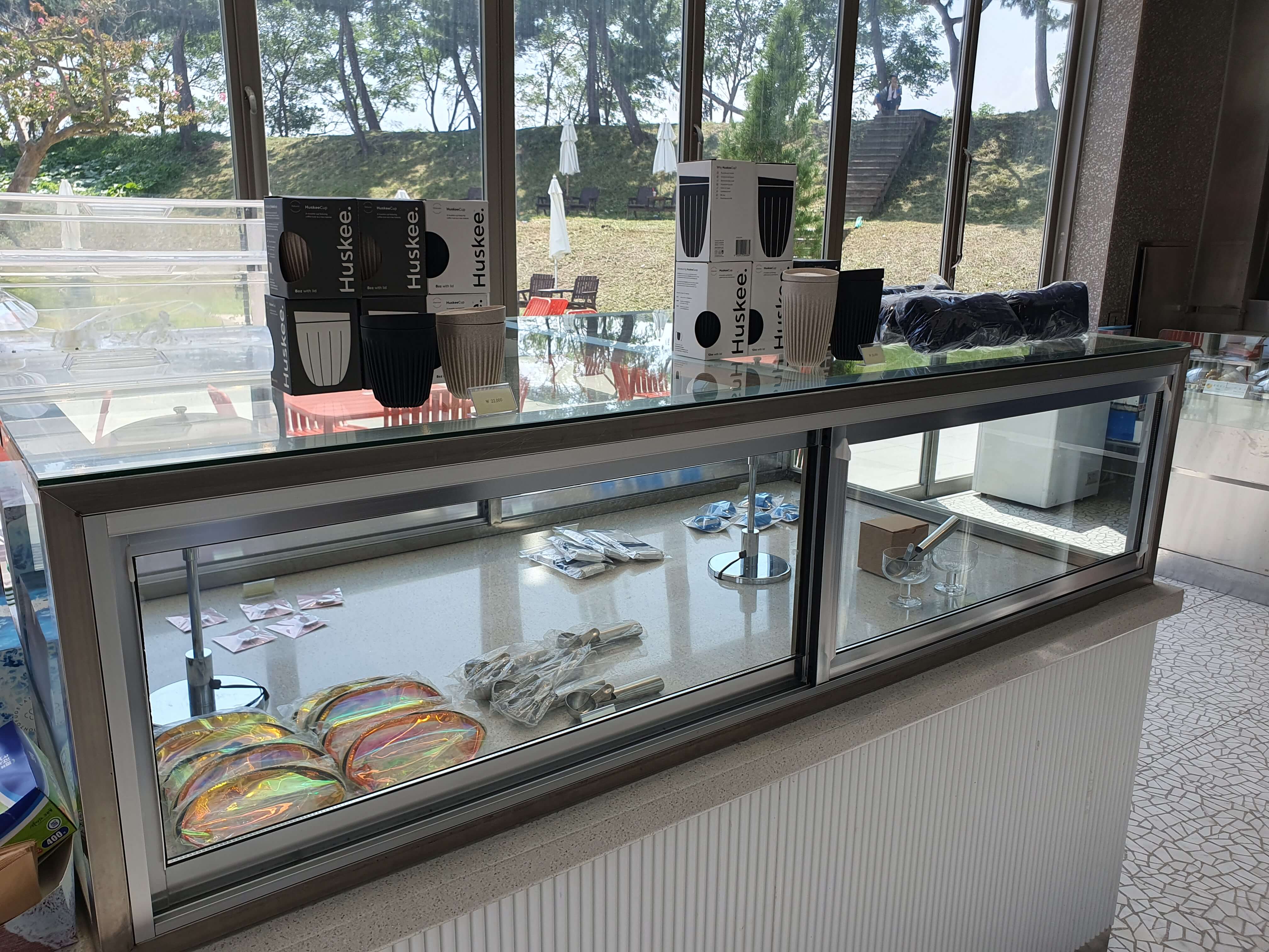1층에는 메뉴 주문, 기념품, 굿즈, 케이크, 냉장음료, 도너츠가 진열되어 있습니다.
