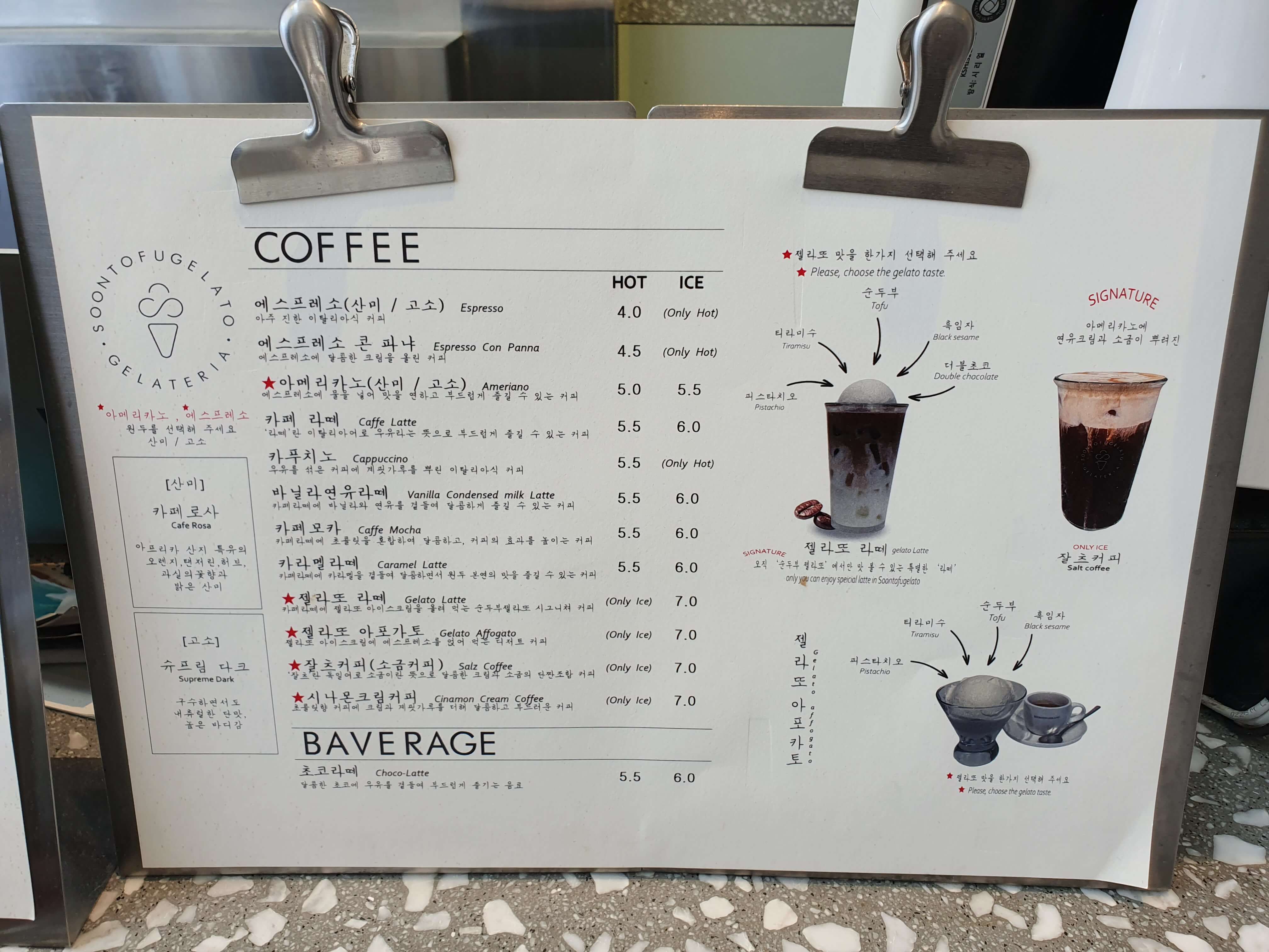 - 주메뉴 : 아메리카노, 젤라또 라떼, 젤라또 아포카토, 잘츠커피(소금커피), 시나몬크림커피, 젤라또 등