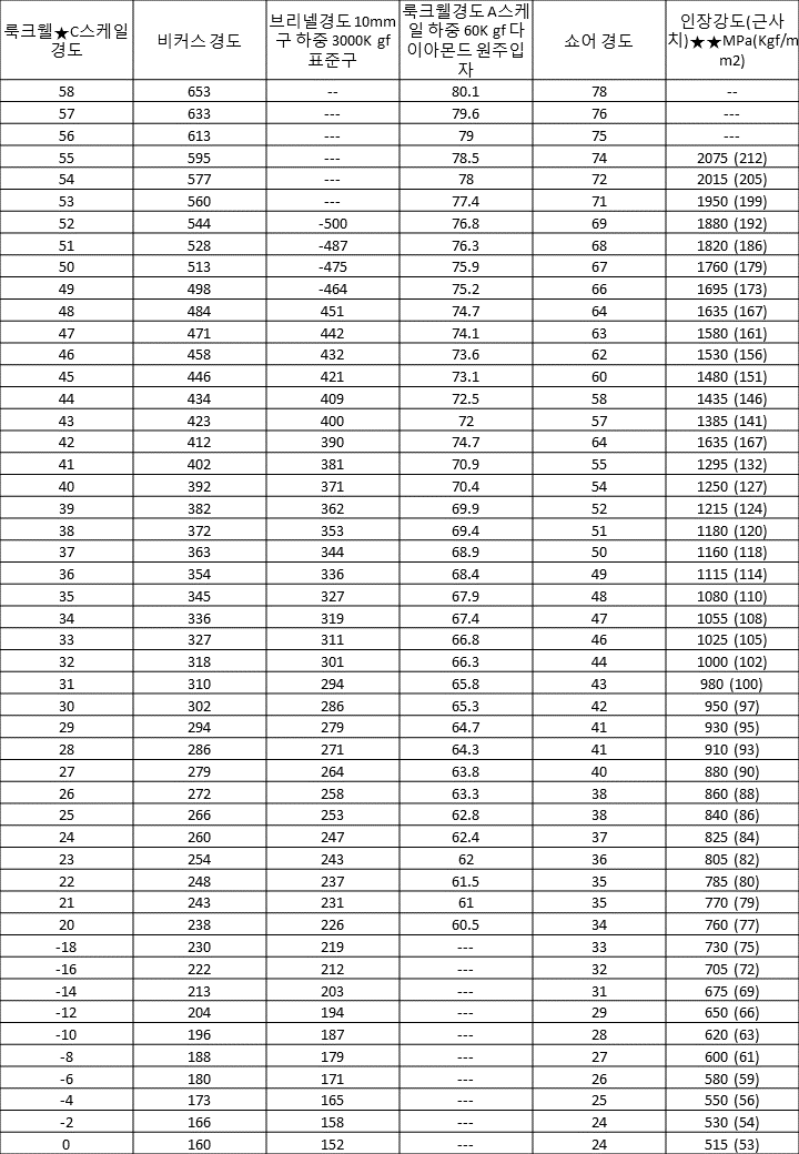 | 로크웰★C스케일경도 | 비커스 경도 | 브리넬경도 10mm구 하중 3000K gf 표준구 | 로크웰경도 A스케일 하중 60K gf 다이아몬드 원주입자 | 쇼어 경도 | 인장강도(근사치)★★MPa(Kgf/mm2) |
