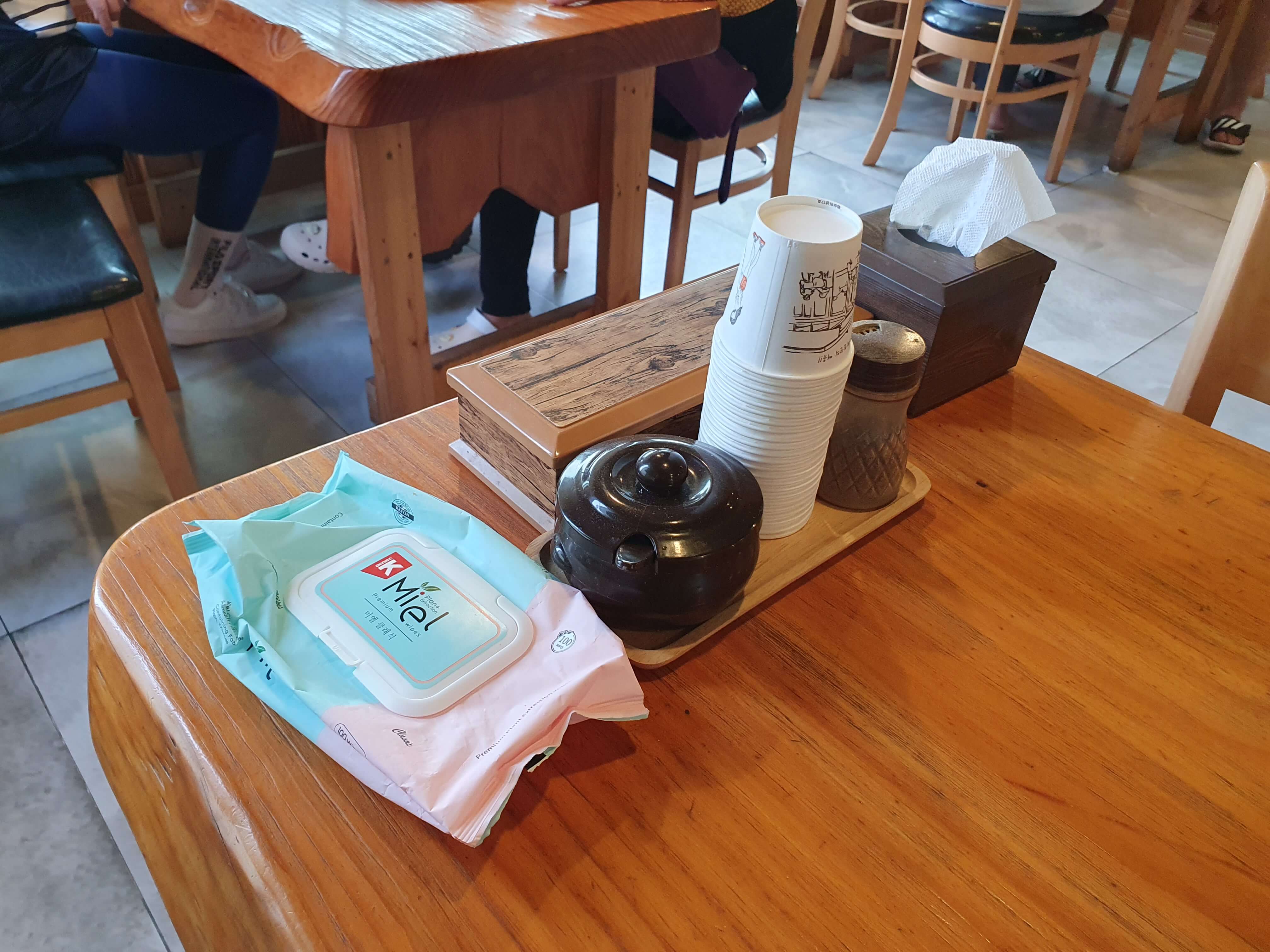 테이블에는 소금, 후추, 종이컵, 물티슈, 휴지, 수저통이 준비되어 있습니다.