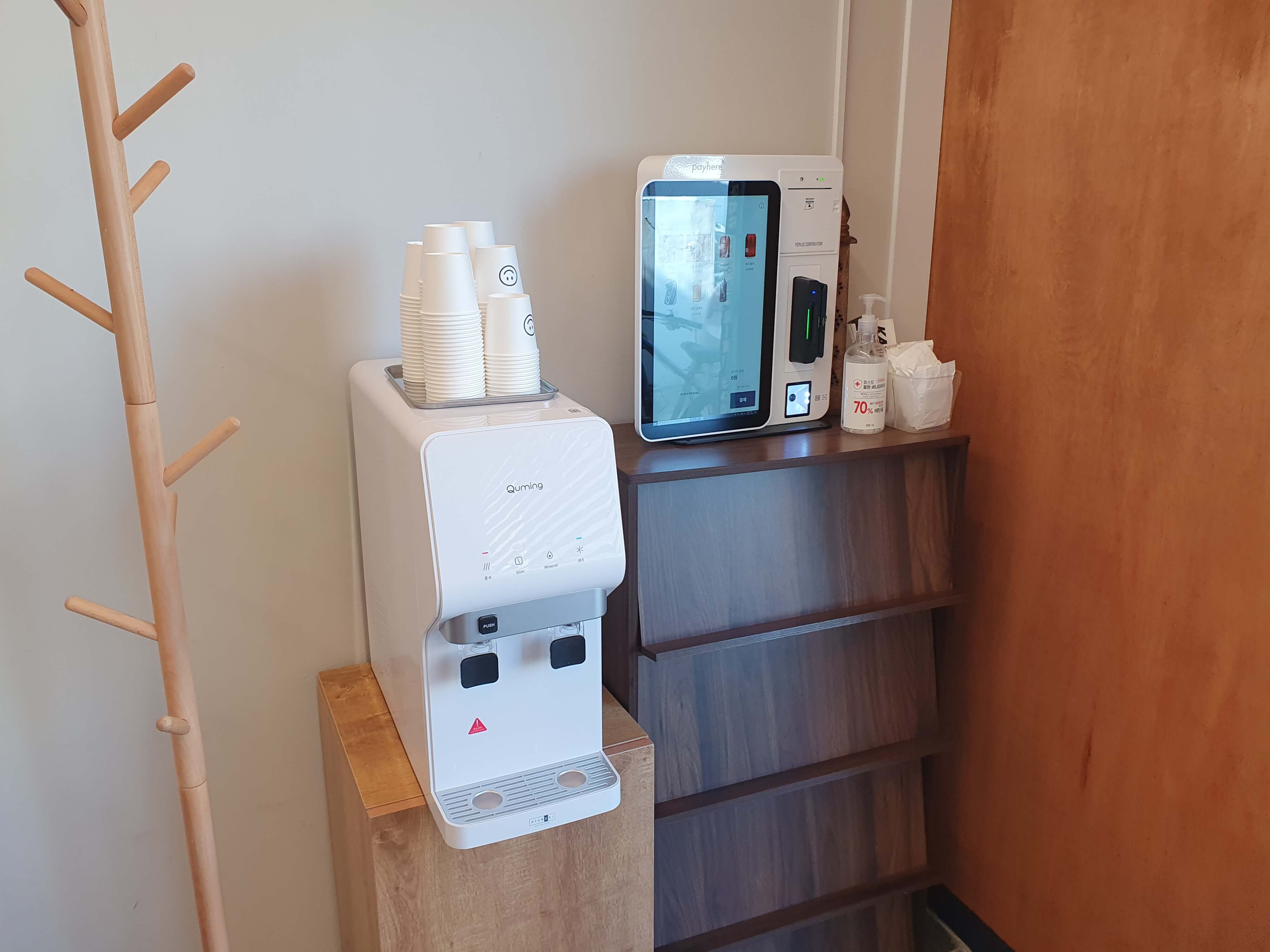 입구 옆에 옷걸이, 정수기, 키오스크가 준비되어 있습니다.