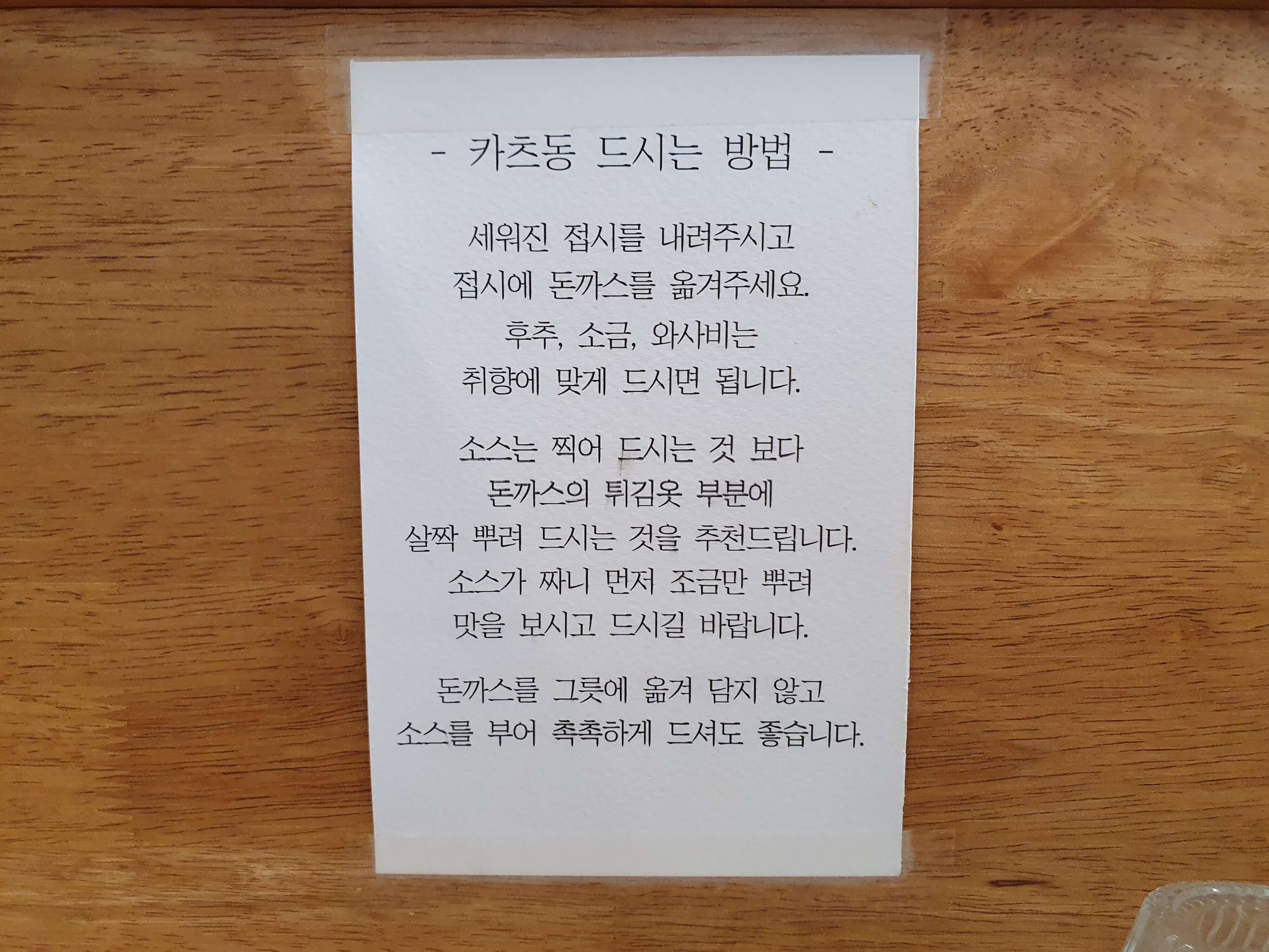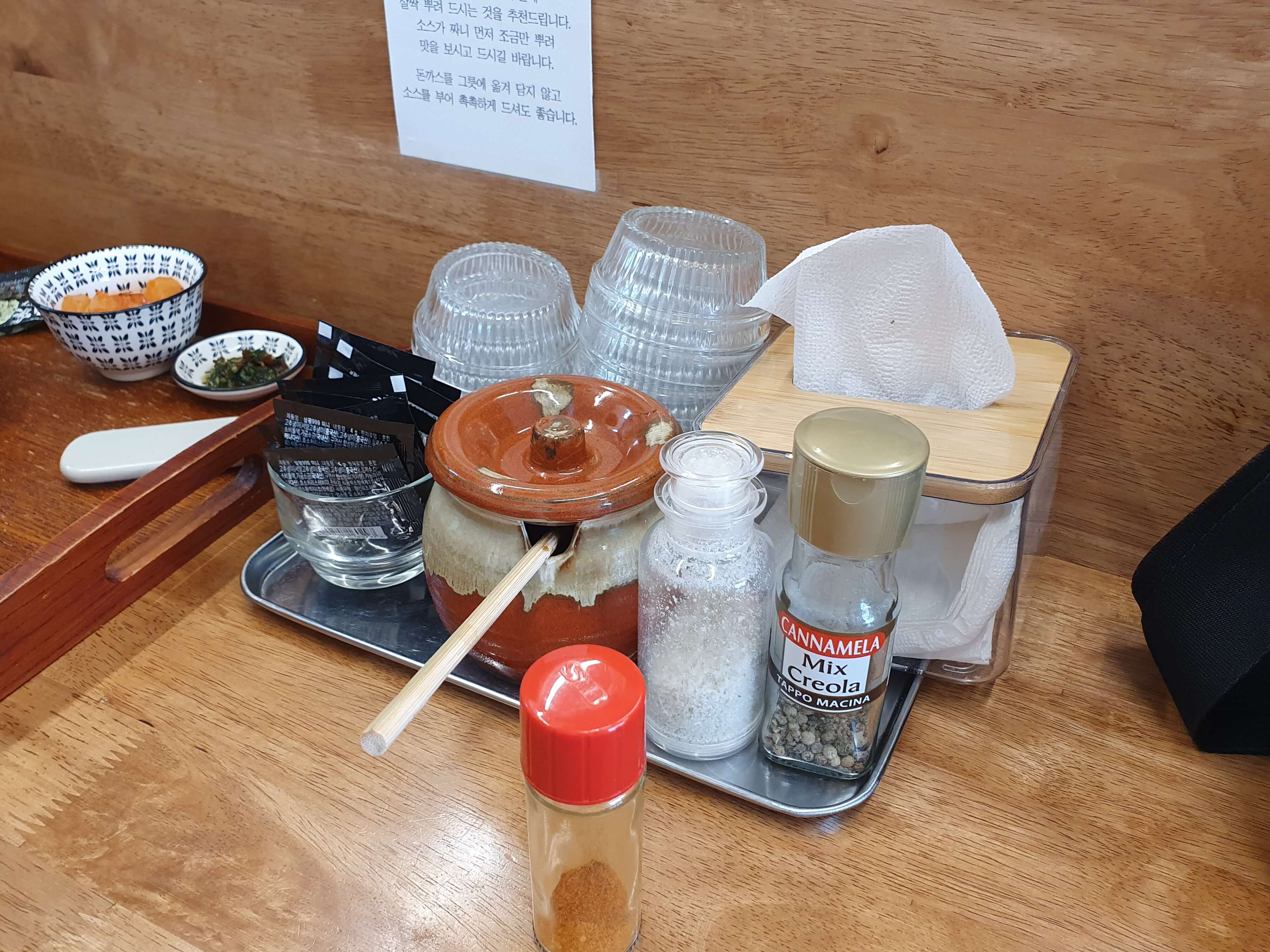 테이블에는 와사비, 돈까스양념, 소금, 후추, 양념접시, 휴지, 시치미(시찌미)가 준비되어 있습니다.