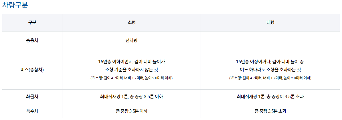 | 버스(승합차) | 15인승 이하이면서, 길이·너비·높이가 소형 기준을 초과하지 않는 것 ※ 소형: 길이 4.7미터, 너비 1.7미터, 높이 2.0미터 이하 |