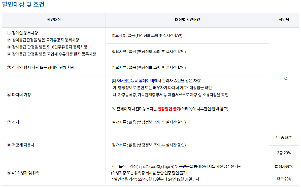 ※ 4.3희생자 및 유족할인의 경우, 제주도청 누리집 또는 읍면동을 통해 사전 접수, 등록되지 않은 차량은 사후할인이 불가합니다.(기기오류인 경우 제외)