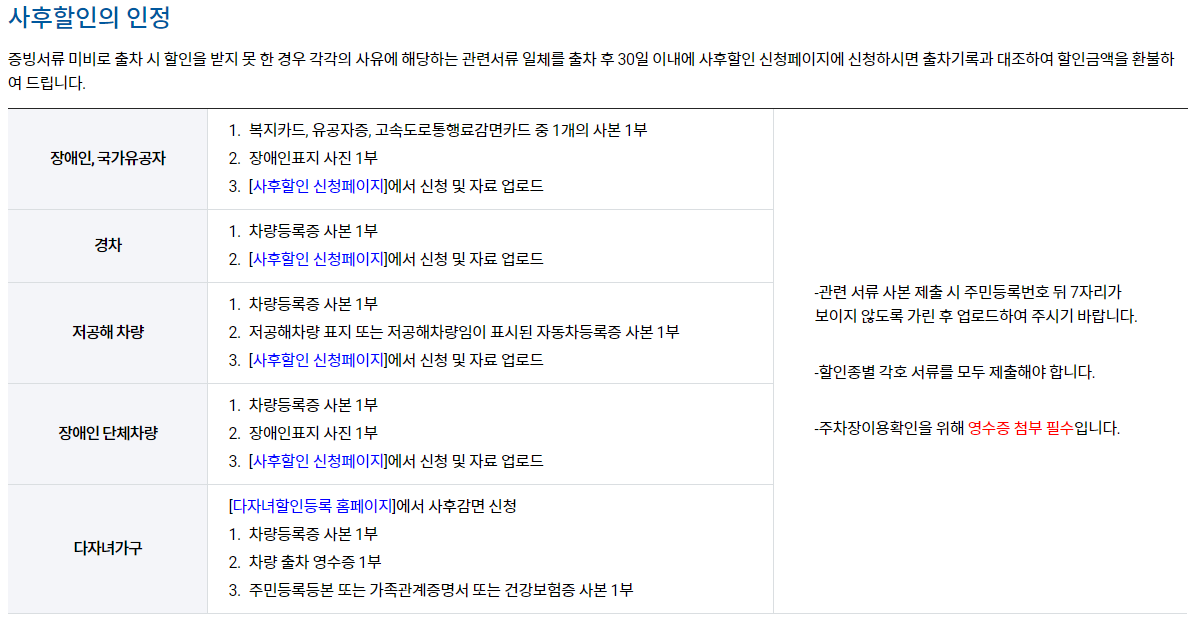 | 장애인, 국가유공자 | 복지카드, 유공자증, 고속도로통행료감면카드 중 1개의 사본 1부 장애인표지 사진 1부 [사후할인 신청페이지]에서 신청 및 자료 업로드 |