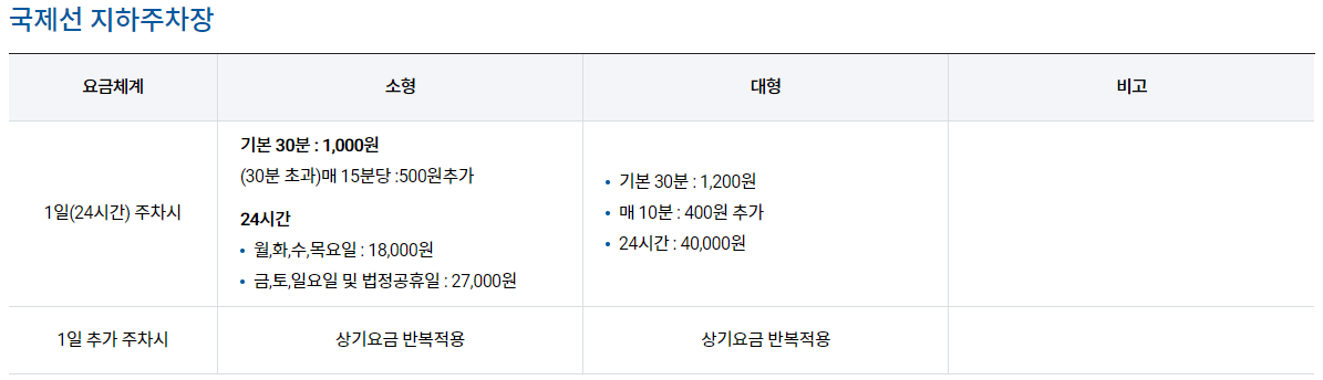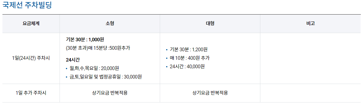 | 대형 | 최초 30분 | 기본요금 : 1,200원 | 입차시간 기준 1일(24시간) 요금 40,000원 |