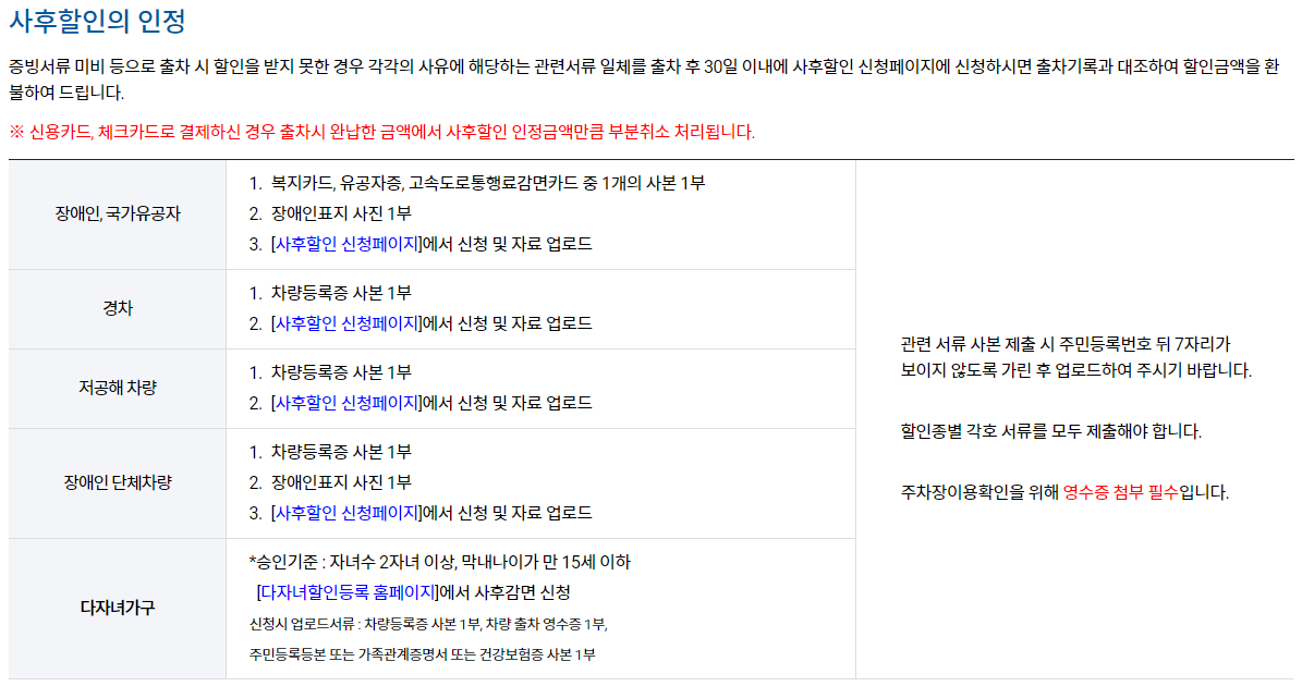 증빙서류 미비 등으로 출차 시 할인을 받지 못한 경우 각각의 사유에 해당하는 관련서류 일체를 출차 후 30일 이내에 사후할인 신청페이지에 신청하시면 출차기록과 대조하여 할인금액을 환불하여 드립니다.