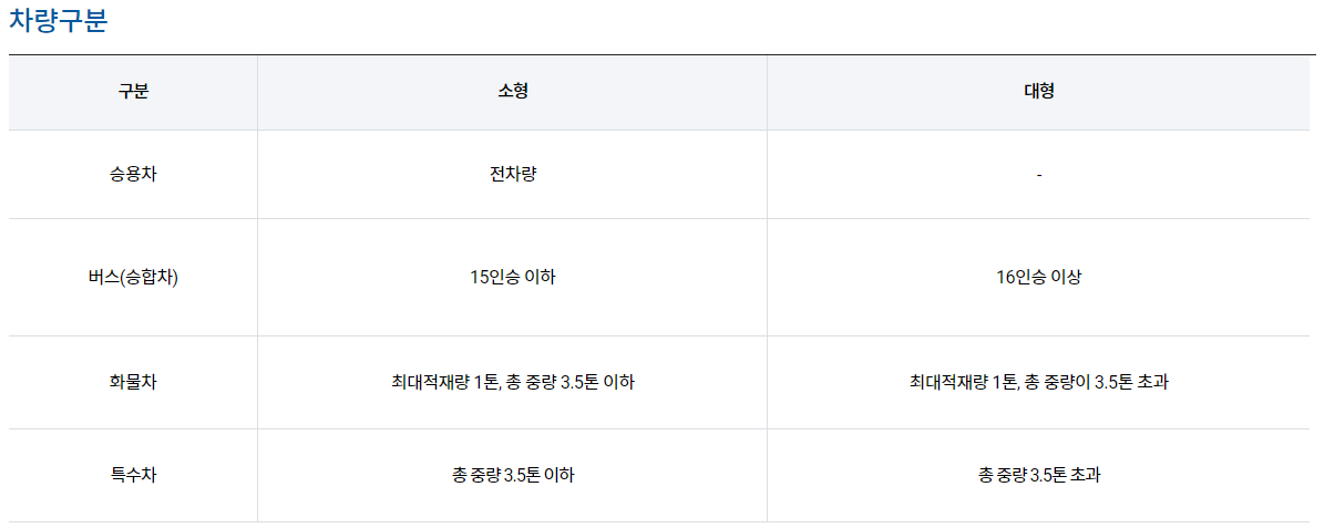 ※ 자동차 종류의 구분은 "자동차관리법" 제3조 및 "자동차관리법 시행규칙" 별표1을 따르되, 자동차 종류별 소형/대형 요금 적용은 위 표를 따름