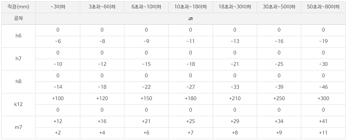 | 직경 | 18초과~30이하 | 30초과~50이하 | 50초과~80이하 |