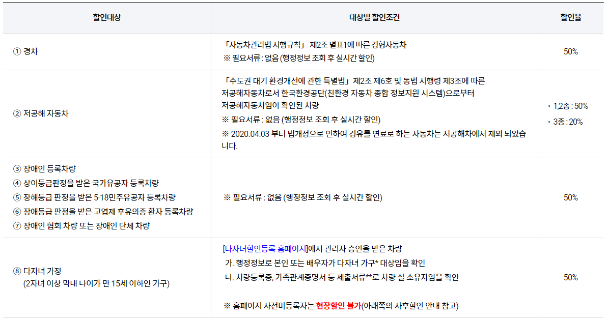 | 저공해 차량 | 차량등록증 사본 1부 저공해차량 표지 또는 저공해차량임이 표시된 자동차등록증 사본 1부 [사후할인 신청페이지]에서 신청 및 자료 업로드 |