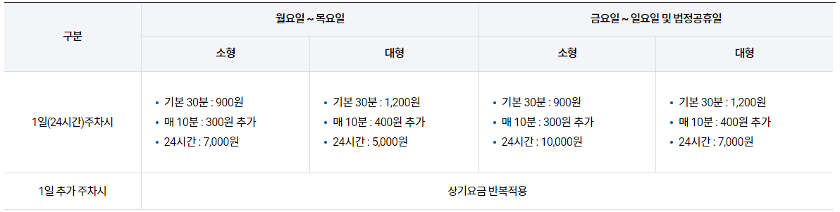 | 월요일~목요일 | 소형 | 기본 30분 : 900원 매 10분 : 300원 추가 24시간 : 7,000원 |