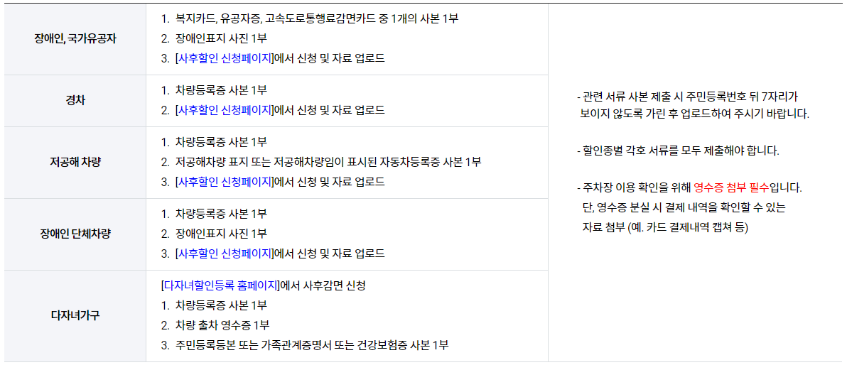 - 관련 서류 사본 제출 시 주민등록번호 뒤 7자리가 보이지 않도록 가린 후 업로드하여 주시기 바랍니다. - 할인종별 각호 서류를 모두 제출해야 합니다. - 주차장 이용 확인을 위해 영수증 첨부 필수입니다. 단, 영수증 분실 시 결제 내역을 확인할 수 있는 자료 첨부 (예. 카드 결제내역 캡쳐 등) |