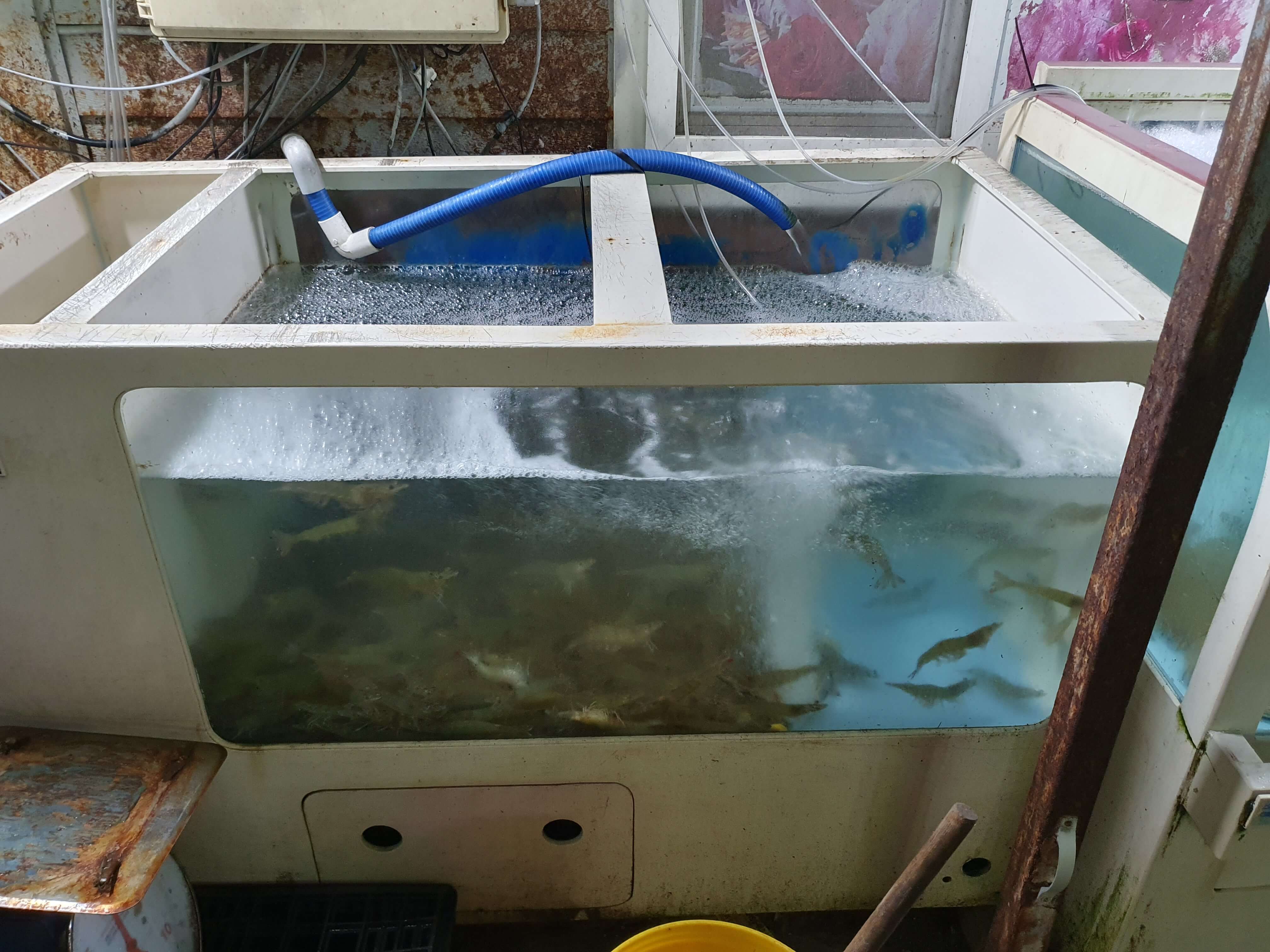 식당 앞에 맛있는 새우들이 담긴 수조가 있습니다.