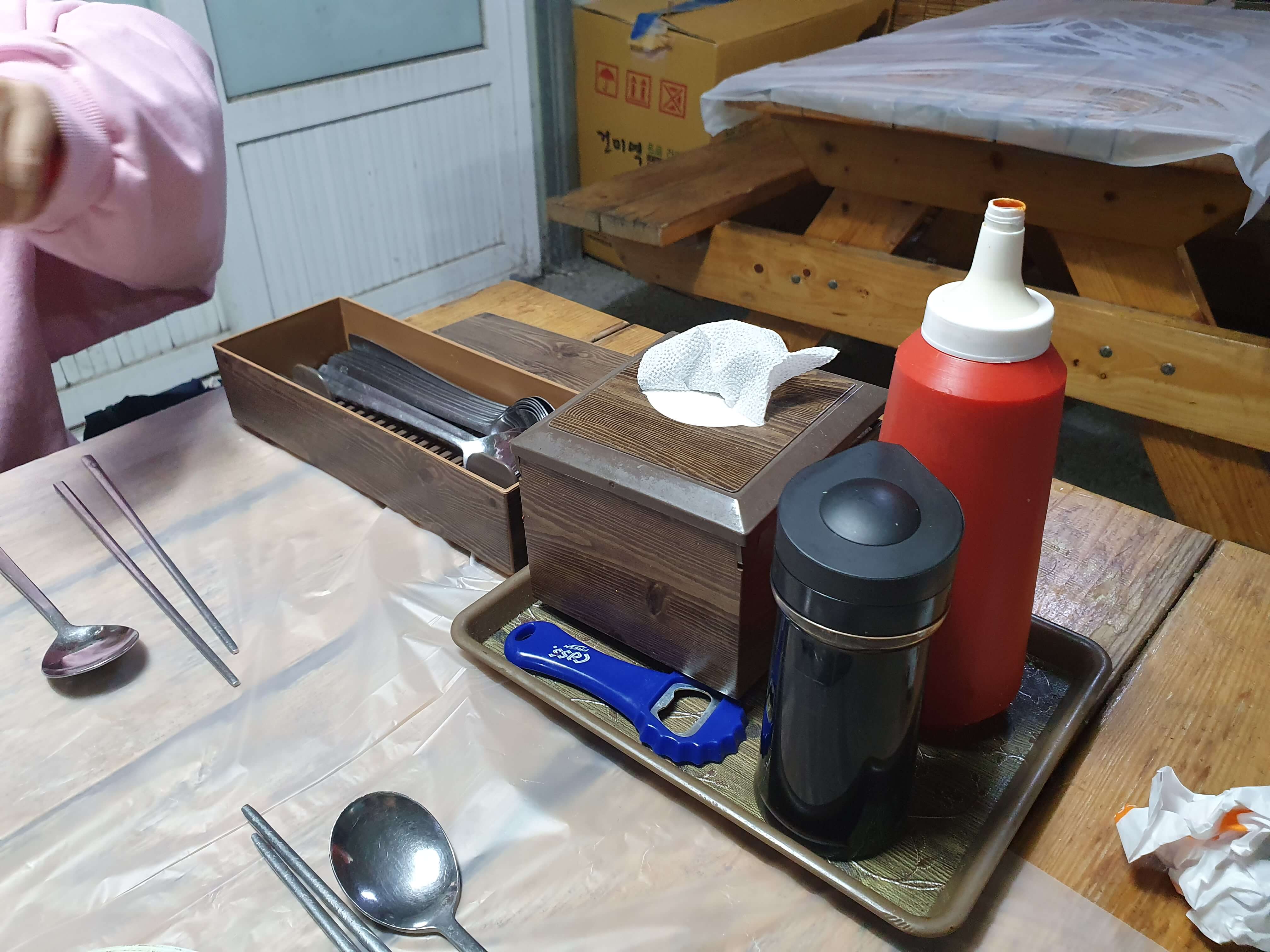 테이블에는 수저통, 휴지, 간장, 초장이 준비되어 있습니다.