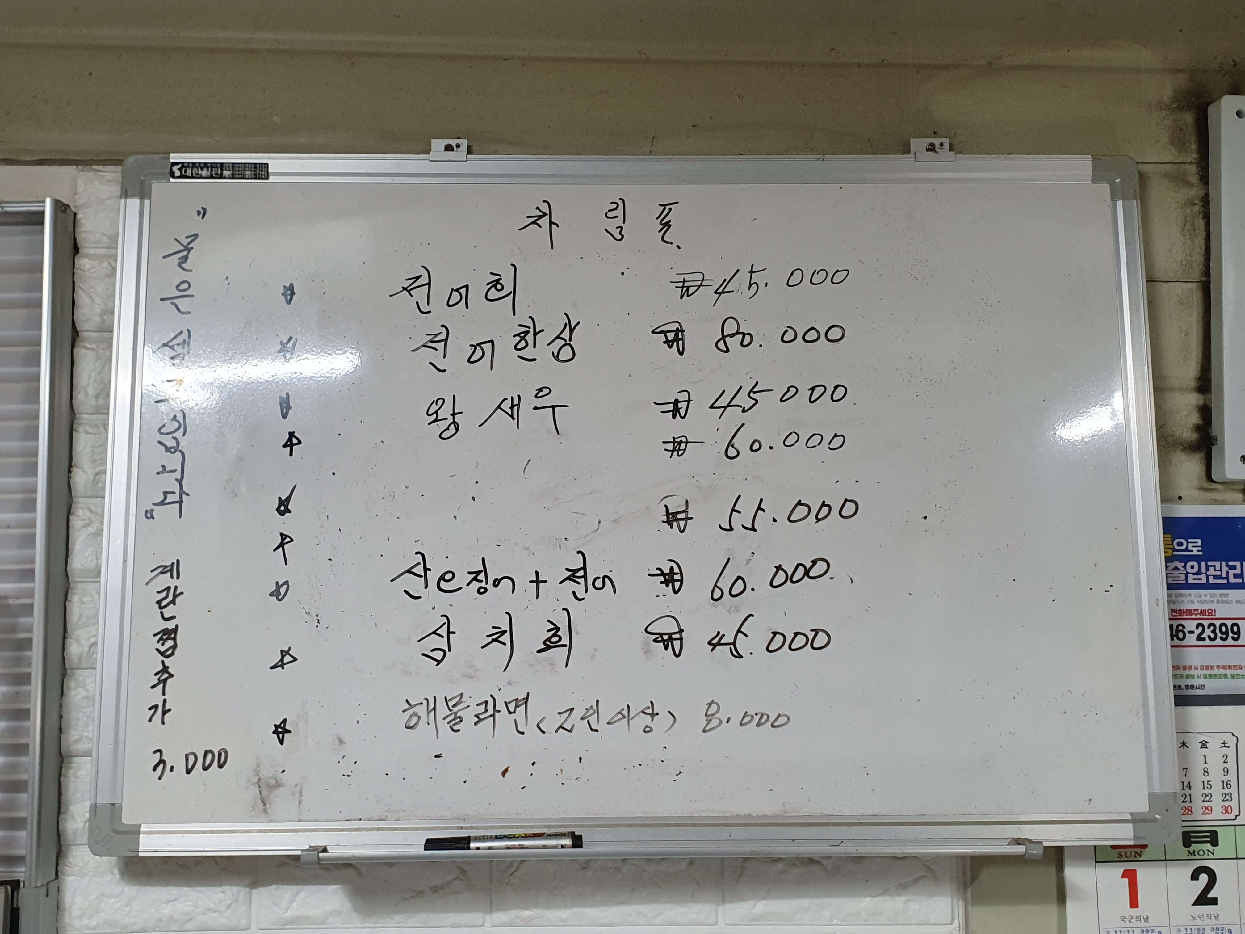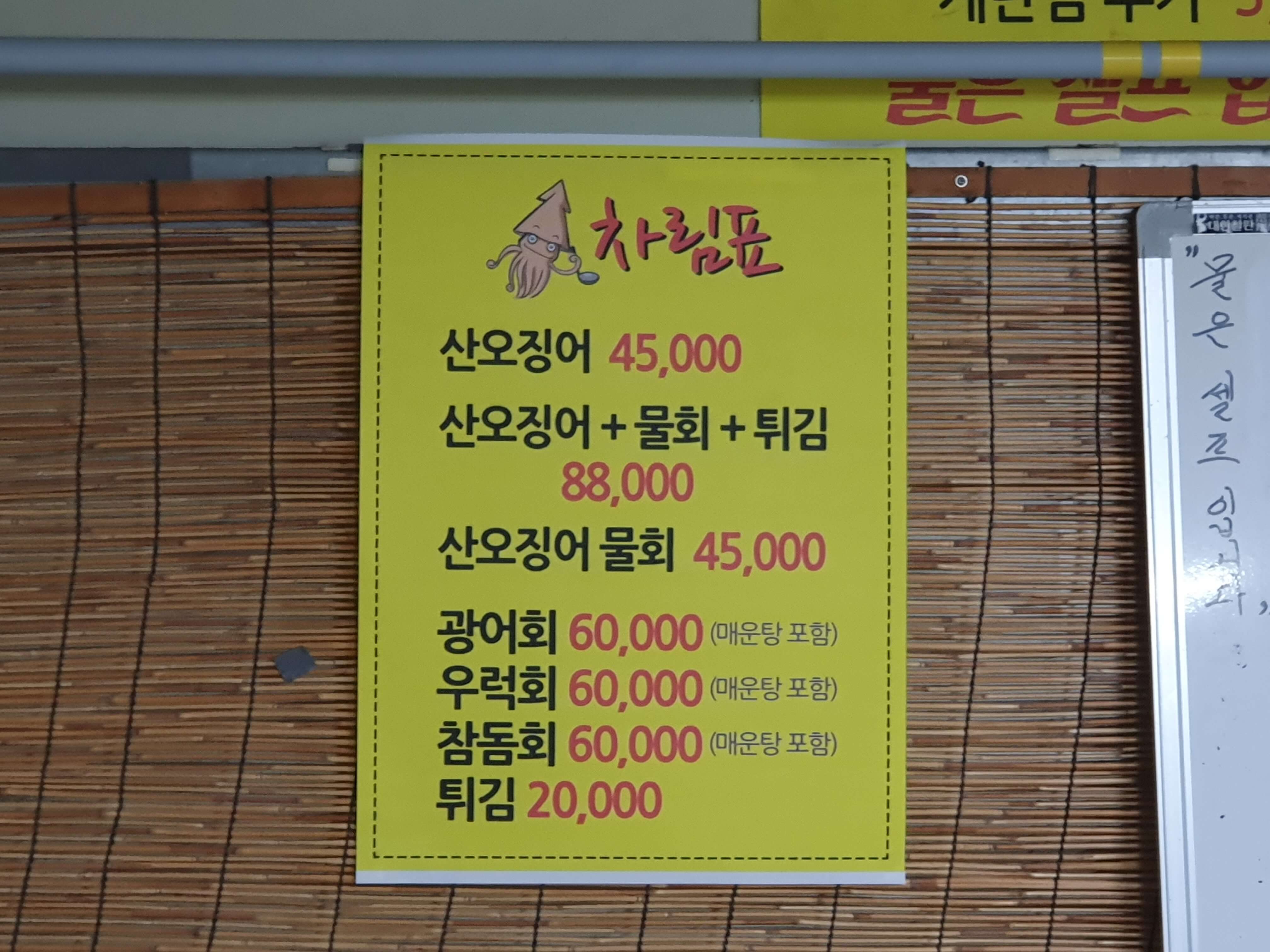 메뉴는 전어회, 전어한상, 왕새우, 산오징어+전어, 삼치회, 해물라면(2인 이상), 산오징어, 산오징어+물회+튀김, 광어회, 우럭회, 참돔회, 튀김이 있습니다.