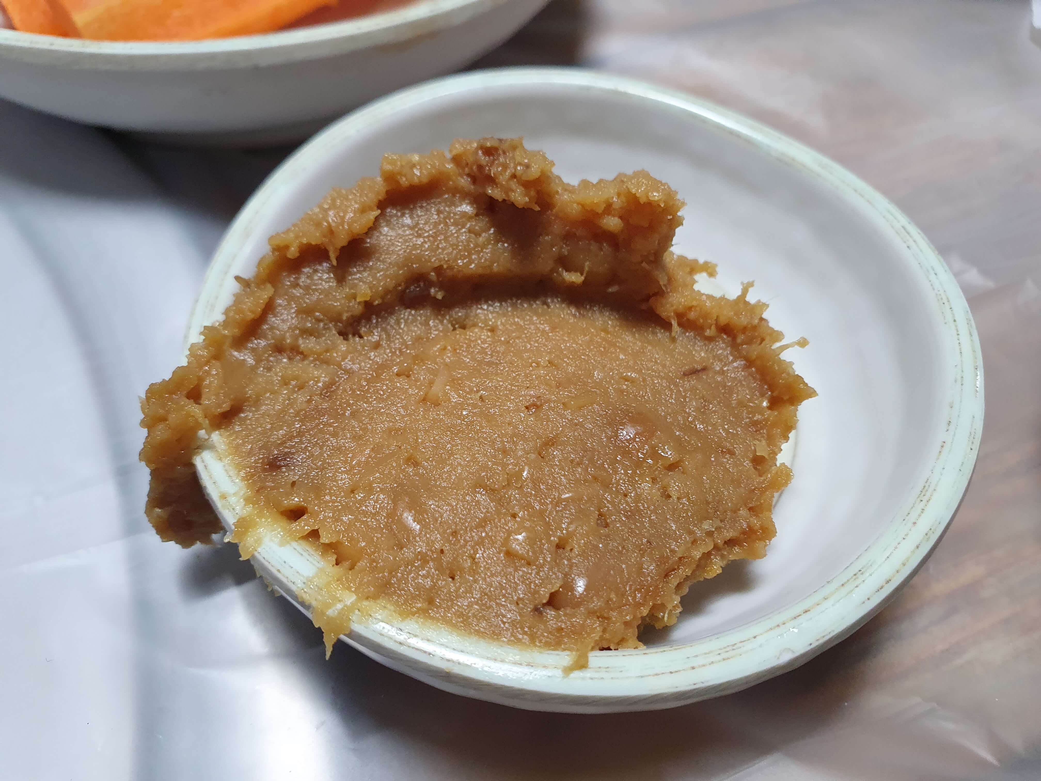 해남의 식당들은 부산과 다르게 쌈장이 아닌 이 색깔의 된장을 주로 사용합니다.