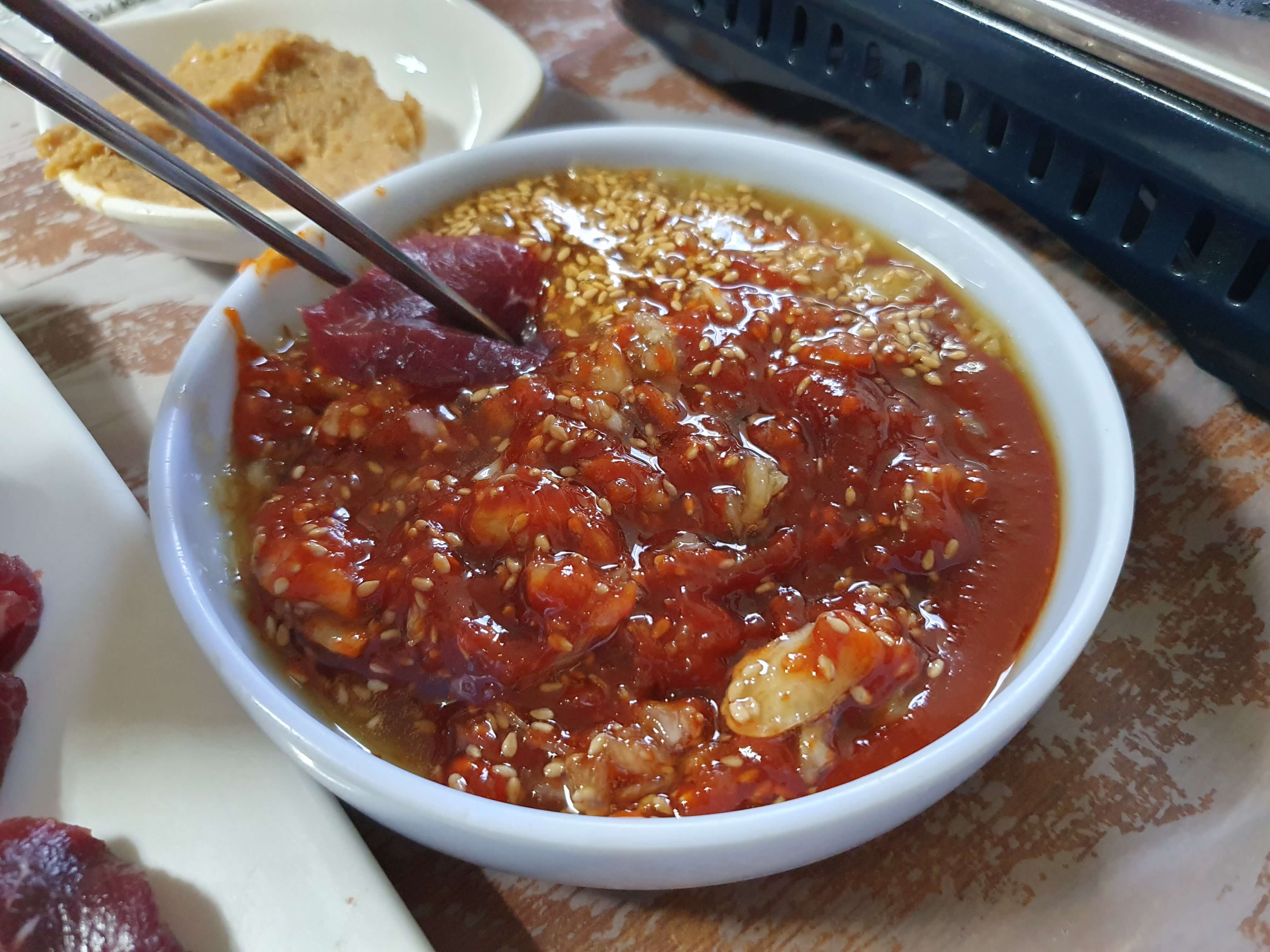 마늘, 고추장, 참기름, 깨소금이 들어간 소스인데 마늘이 매워서 많이 찍어 먹으면 알싸한 맛이 계속 맴돕니다.