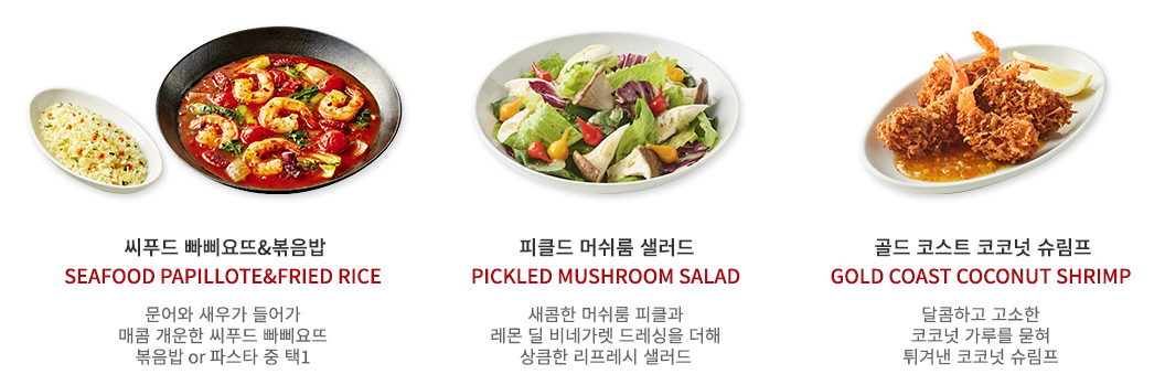 씨푸드 빠삐요뜨&볶음밥 or 파스타 / 피클드 머쉬룸 샐러드 / 골드 코스트 코코넛 슈림프
