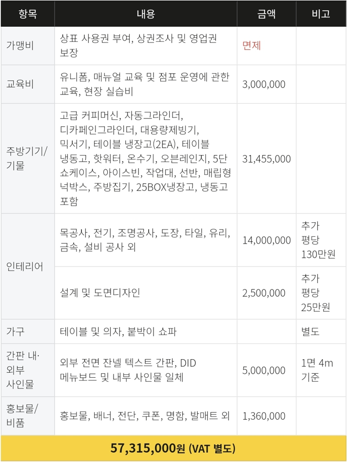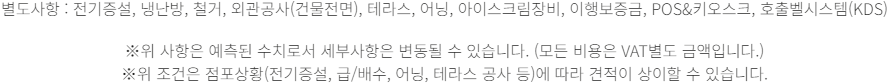 ※ 별도사항 : 전기증설, 냉난방, 철거, 외관공사(건물전면), 테라스, 어닝, 아이스크림장비, 이행보증금, POS&키오스크, 호출벨시스템(KDS)