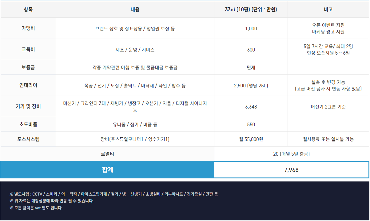 | 가맹비 | 브랜드 상호 및 상표상용 / 영업권 보장 / 오픈 이벤트 지원 / 마케팅 광고 지원 | 1,000 | 오픈 이벤트 지원 마케팅 광고 지원 |