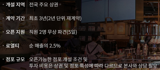 - 점포 규모 : 오픈가능한 점포 개설 조건 및 투자 비용은 상권 및 점포 특성에 따라 다르므로 본사와 상담 필요