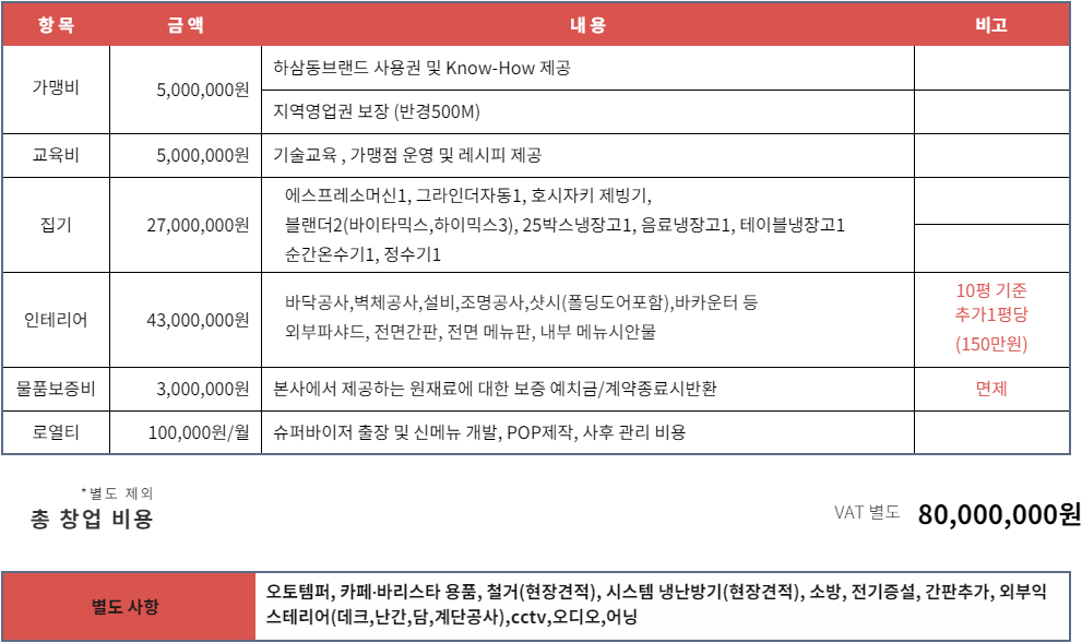 | 물품보증비 | 3,000,000원 | 본사에서 제공하는 원재료에 대한 보증 예치금/계약종료시반환 | 면제 |