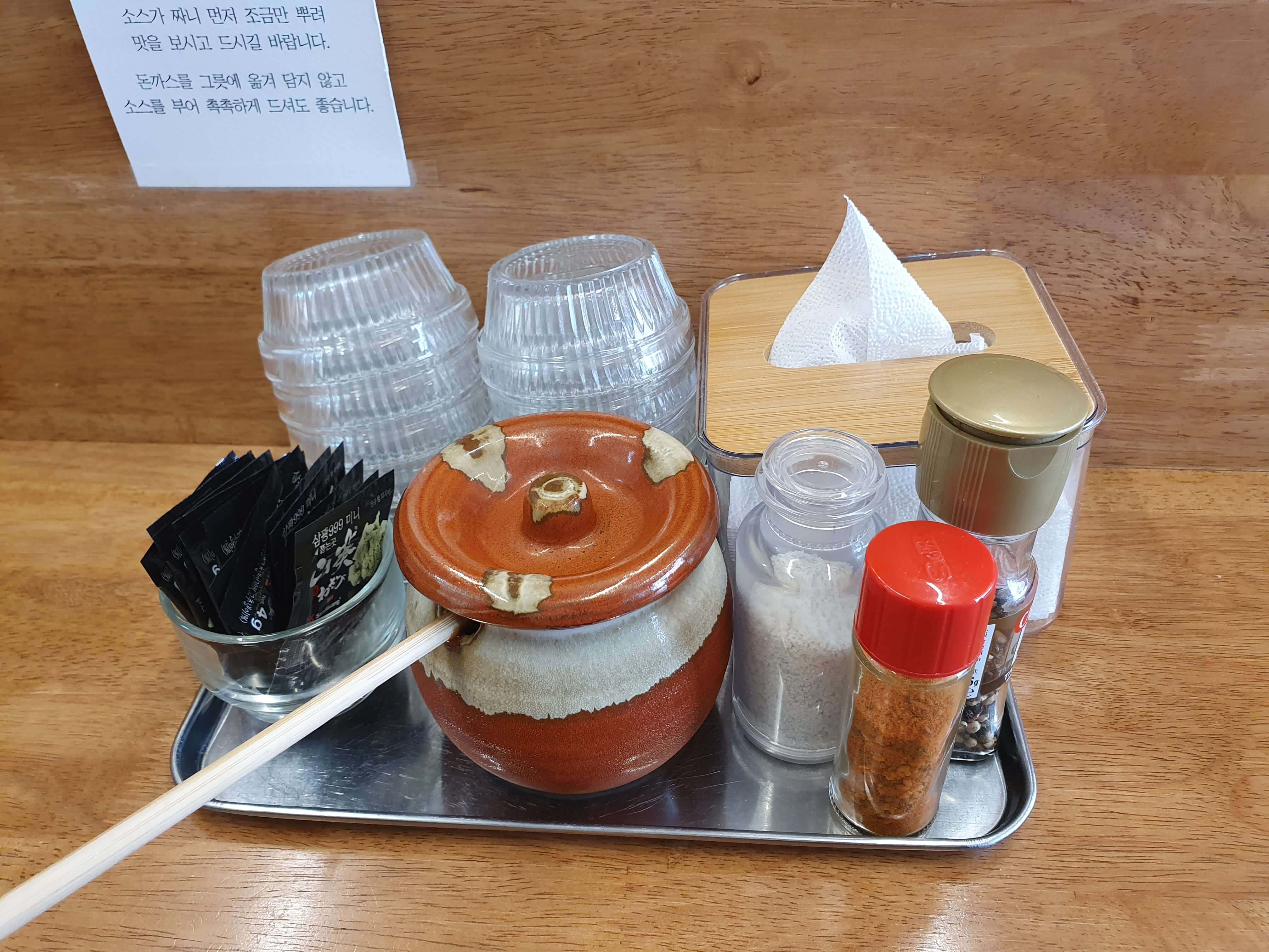테이블에는 와사비, 돈까스 소스, 소금, 후추, 시치미, 휴지가 준비되어 있습니다.