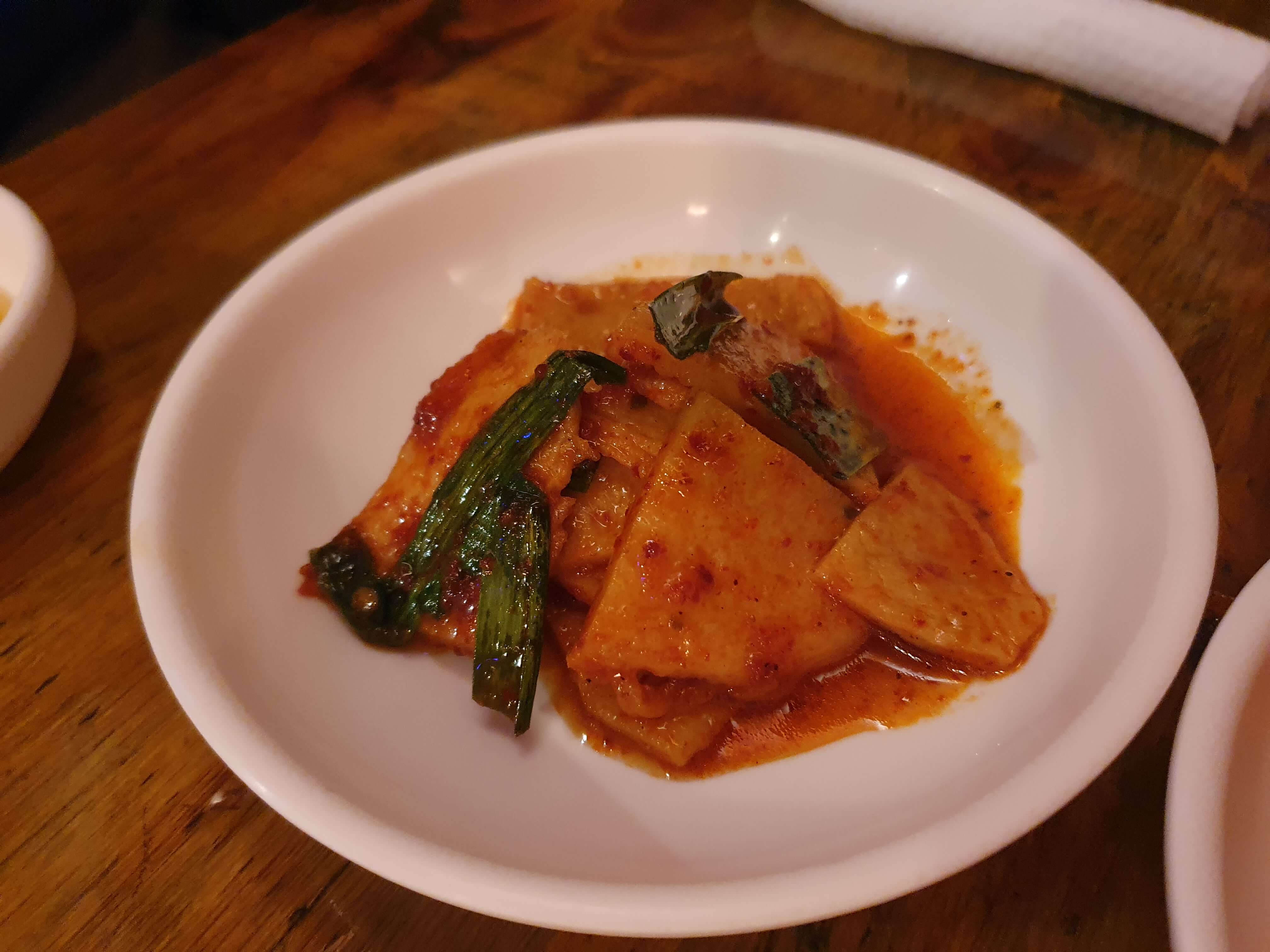 이번에 기본 반찬은 깍두기, 어묵볶음, 시금치나물이었습니다.