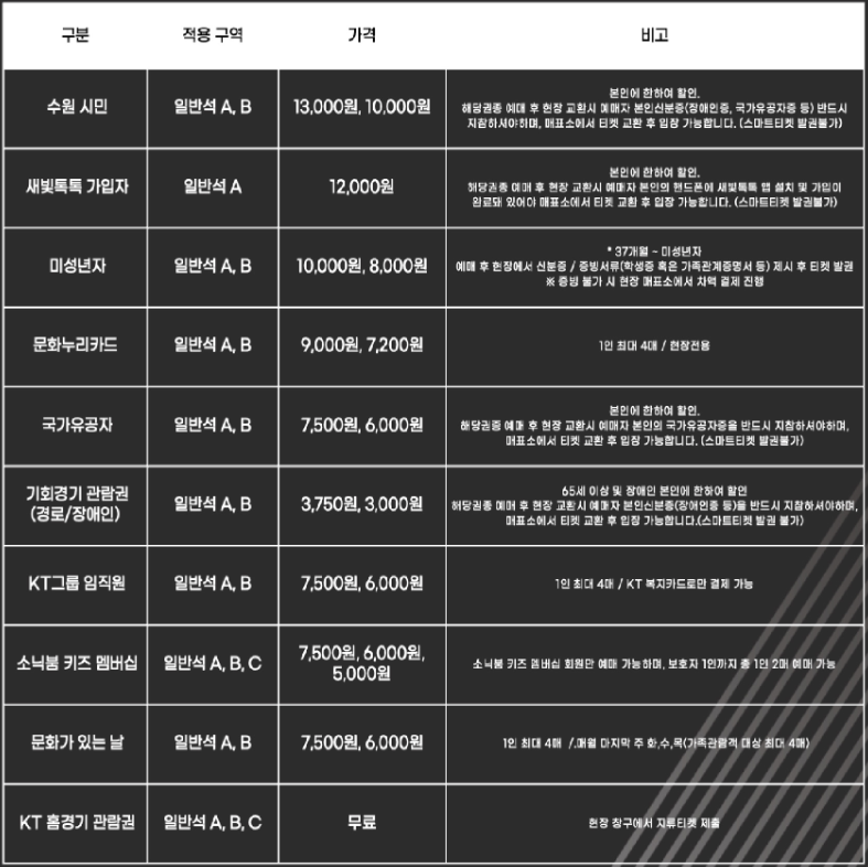 | 수원 시민 | 일반석 A, B | 13,000원, 10,000원 | 본인에 한하여 할인. 해당권종 예매 후 현장 교환시 예매자 본인신분증(장애인증, 국가유공자증 등) 반드시 지참하셔야 하며, 매표소에서 티켓 교환 후 입장 가능합니다. (스마트티켓 발권 불가) |