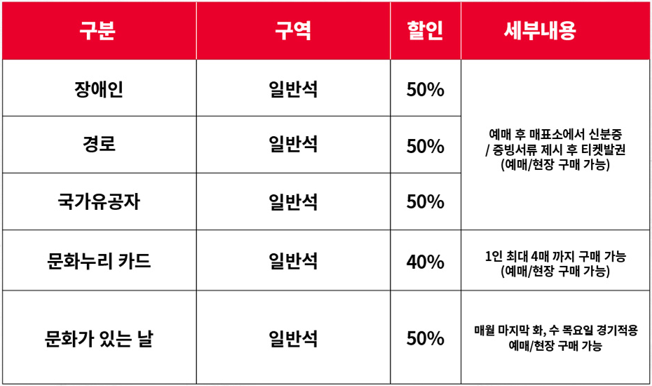 | 문화누리카드 | 일반석 | 40% | 1인 최대 4매까지 구매 가능 (예매/현장 구매 가능) |