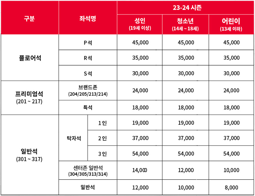 | 구분 | 좌석명 | 성인 (19세 이상) |