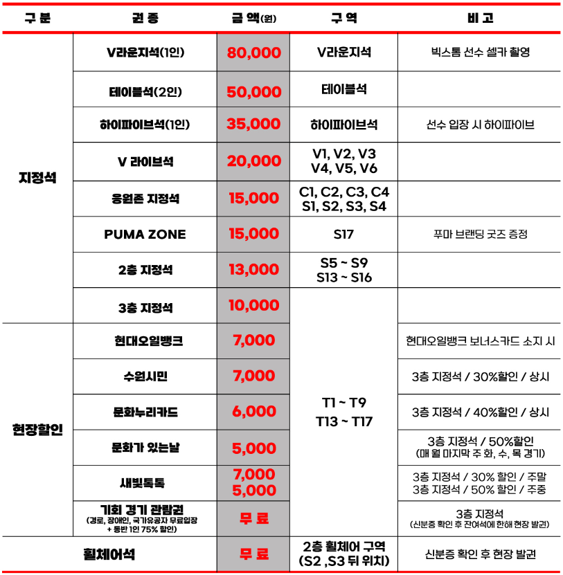| 문화가 있는 날 | 5,000 | 3층 지정석 / 50% 할인 (매월 마지막 주 화, 수, 목 경기) |