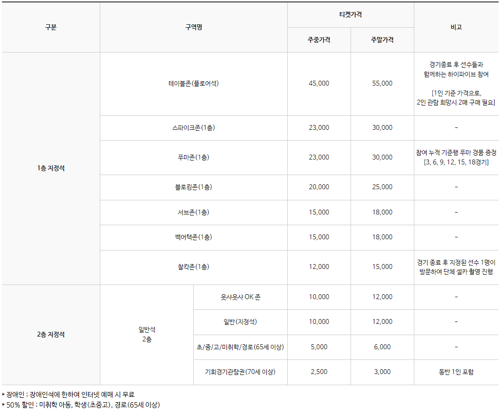 45,000 | 55,000 | 경기 종료 후 선수들과 함께하는 하이파이브 참여 1인 기준 가격으로, 2인 관람 희망시 2매 구매 필요 |