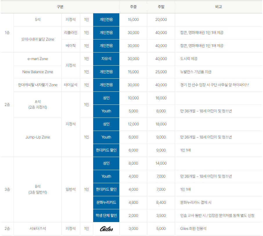 | 2층 | 서포터즈석 | 지정석 | Giles | 3,000 | 5,000 | Giles 회원 전용석 |