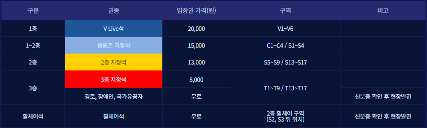 | 1~2층 | 응원존 지정석 | 15,000 | C1~C4 S1~S4 |