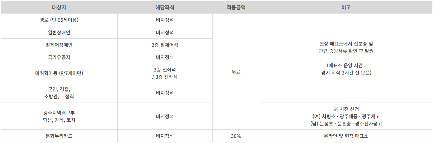 | 경로 (만 65세이상) | 비지정석 | 무료 | 현장 매표소에서 신분증 및 관련 증빙서류 확인 후 발권 (매표소 운영 시간 : 경기 시작 2시간 전 오픈) |