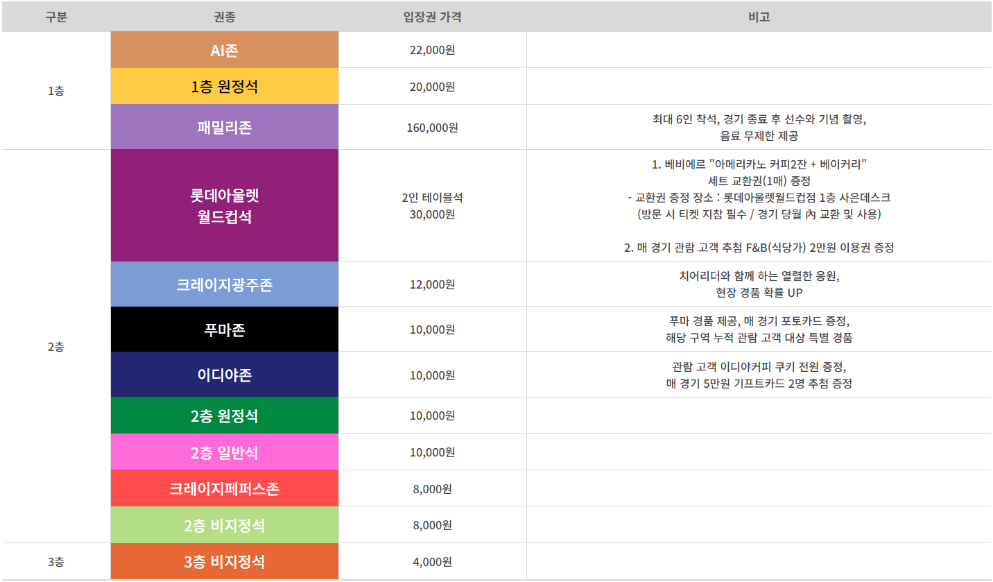 | 푸마존 | 10,000원 | - 푸마 경품 제공, 매 경기 포토카드 증정 - 해당 구역 누적 관람 고객 대상 특별 경품 |