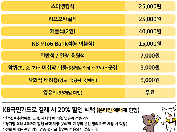 - 경기당 최대 4매까지 할인 혜택 제공 (WKBL 계정의 본인 명의 카드 사용시 적용)