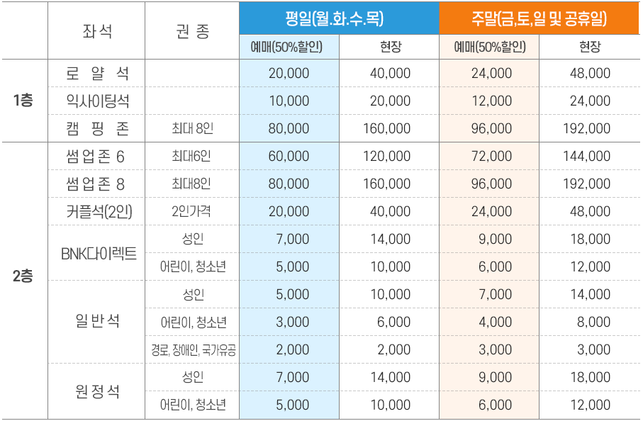 | 1층 | 로얄석 | 20,000 | 40,000 | 24,000 | 48,000 | |