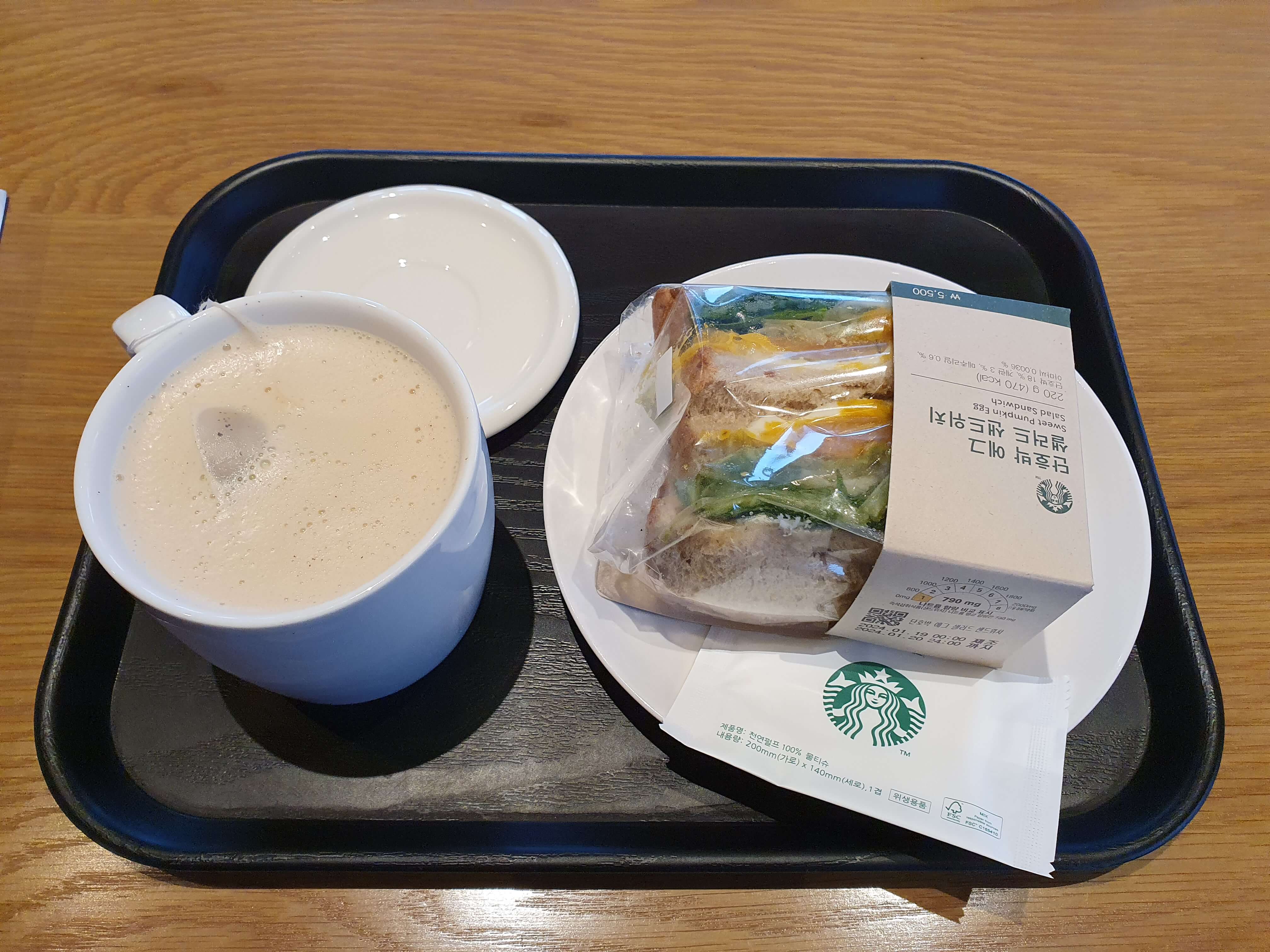 스타벅스 클래식 밀크티와 단호박 에그 샐러드 샌드위치의 조합이 아주 좋습니다.